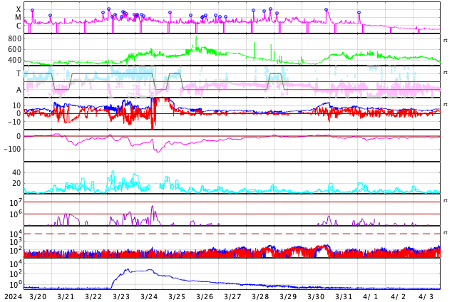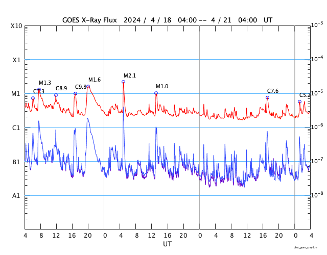 GOES衛星の太陽X線強度。赤・橙 = 0.1〜0.8 nm、青・紫 = 0.05〜0.4 nm (c) データ:NOAA/SWPC、作図:宇宙天気ニュース ![]() | ||||||||||||||||||||||||||||||||||||||||||||||||||||||||||||||||||||||||||||||||||||||||||||||||||||||||||||||||||||||||||||||||||||||||||||||||||||||||||||||||||||||||||||||||||||||||||||||||||||||||||||||||||||||||||||||||||||||||||||||||||||||||||||||||||||||||||||||||||||||||||||||||||||||||||||||||||||||||||||