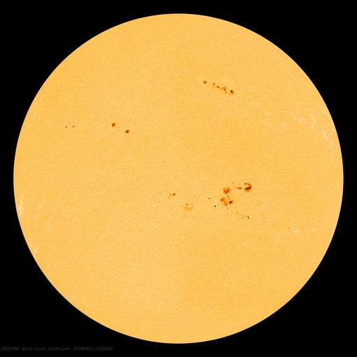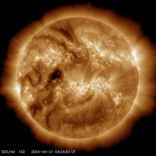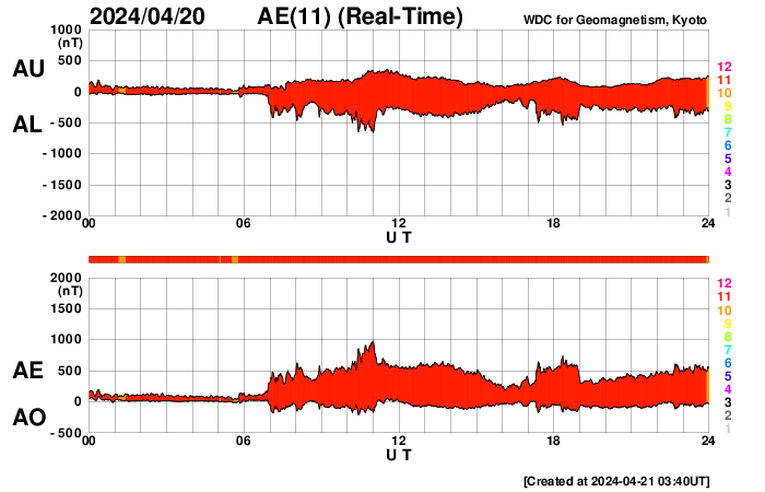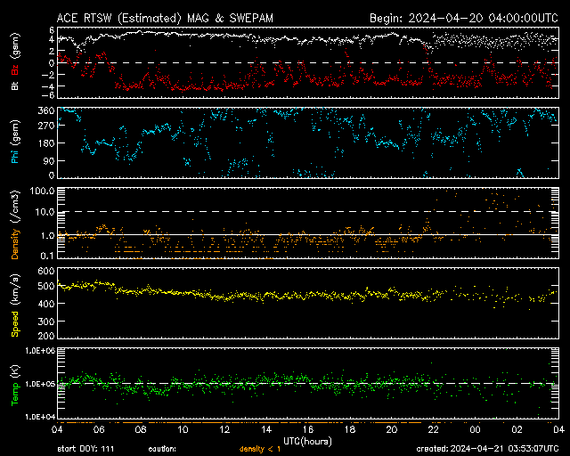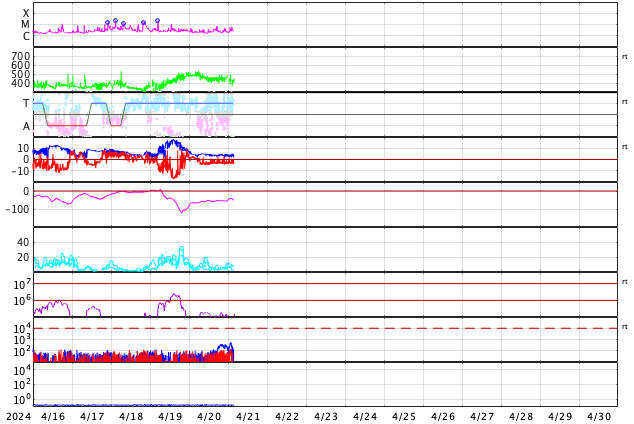 2024/ 4/21 12:54 更新 太陽風磁場の南向きが続き、磁気圏の活動が強まっています。 担当 篠原 太陽風の速度は500km/秒から420km/秒へ下がり、 平均的な速度に戻っています。 磁場強度は、4〜5nTと平均的な状態です。 磁場の南北成分は、南向きの傾向が続いています。 磁気圏の活動も高まった状態が続き、 AE指数は500nT前後の中規模の変化が続いています。 太陽風のグラフの最後では、 磁場の南向きの変化は少し小さくなっている様です。 この後はどの様に推移するでしょうか。 太陽は、中心部の南西側(右下)に進んだ3645黒点群で、 C7.5、C4.9、C5.7などの小規模フレアが、 また、3638群で、C4.9、C3.2、C5.9などの 小規模フレアが発生しています。 規模はやや小さくなっていますが、 領域としては活動的な状態が続いています。 引き続き注目してください。