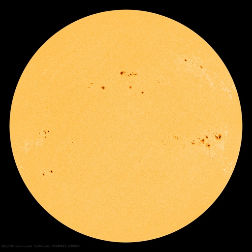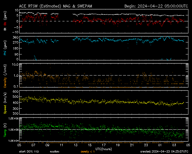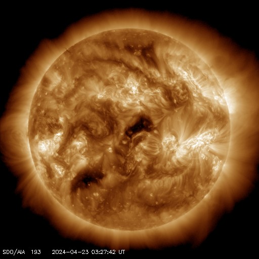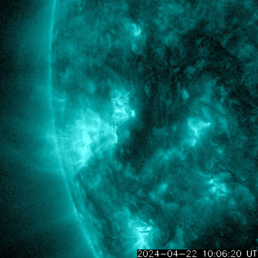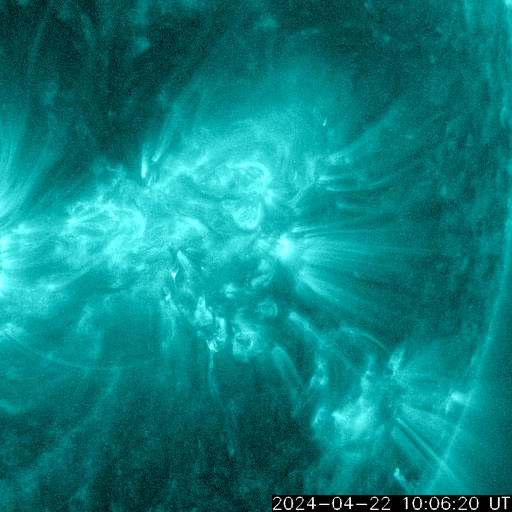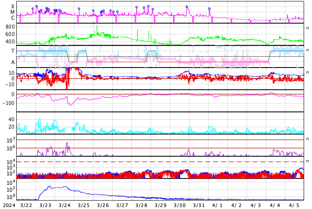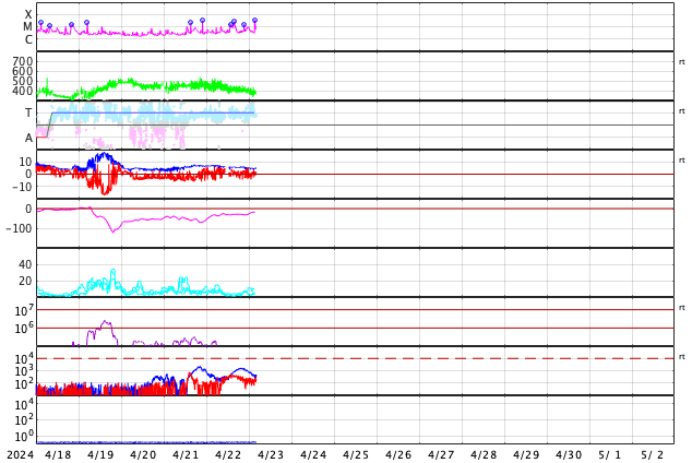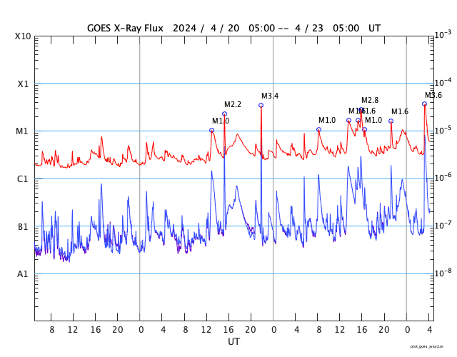 2024/ 4/23 13:26 更新 Mクラスのフレアが頻繁に発生しています。 担当 篠原 太陽で、Mクラスフレアの発生が増えています。 南西側(右下)の3645黒点群で、M1.0、M1.6、M1.1、 3638群で、M1.5の中規模フレア。 東側(左側)の3656群で、M2.8、M1.0、 3654群で、M3.6の中規模フレアが発生しています。 それぞれの活動の様子を、 SDO衛星AIA131の動画で紹介します。 南東側の領域はこれから太陽の中心に近付くので、 今後の活動に注目してください。 太陽風は、速度が450km/秒から370km/秒へ下がり、 低速になっています。 磁場強度は7nTから5nTに少し下がっていますが、 平均的な状態です。 磁場の南北成分は、 0nT付近で小さく南北に変化しています。 磁気圏は概ね静穏で、 AE指数はグラフの途中まで200nTの小規模の変化が続き、 最後は変化が小さくなっています。 SDO衛星AIA193の太陽コロナ写真を見ると、 太陽の中心部と南東側(左下)に 小さいコロナホールが見えています。 3日後くらいに影響がやって来るでしょうか。 ![]() 南西側の3645、3638黒点群の活動の様子。 (c) SDO衛星AIA131 (NASA)、(動画加工 : 宇宙天気ニュース) ![]() 東側の3656、3654黒点群の活動の様子。 (c) SDO衛星AIA131 (NASA)、(動画加工 : 宇宙天気ニュース) ![]() SDO衛星のAIA193カメラによる太陽コロナの様子 (c) SDO (NASA) ![]() SDO衛星による太陽の可視光写真。マウスの矢印を写真に重ねると、黒点番号付きの写真に切り替わります。 (c) SDO (NASA) ![]() GOES衛星の太陽X線強度。赤・橙 = 0.1〜0.8 nm、青・紫 = 0.05〜0.4 nm (c) データ:NOAA/SWPC、作図:宇宙天気ニュース ![]() ACEが観測した太陽風の磁場(1番上の枠、白線は全体の強度、赤線は南北成分) および、太陽風の密度(3番目の橙線)、速度(4番目の黄線) (c) NOAA/SWPC ![]() AE指数(速報値) 下段のAEグラフの値が高くなると、オーロラ活動が活発化しています。 (c) 京都大学WDC ![]() ![]() 27日の太陽周期に合わせた図 太陽が同じ面を地球に向けていた27日前の変化から、今後を予想することができます。 (c) 作図:宇宙天気ニュース