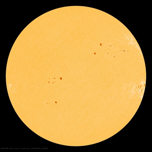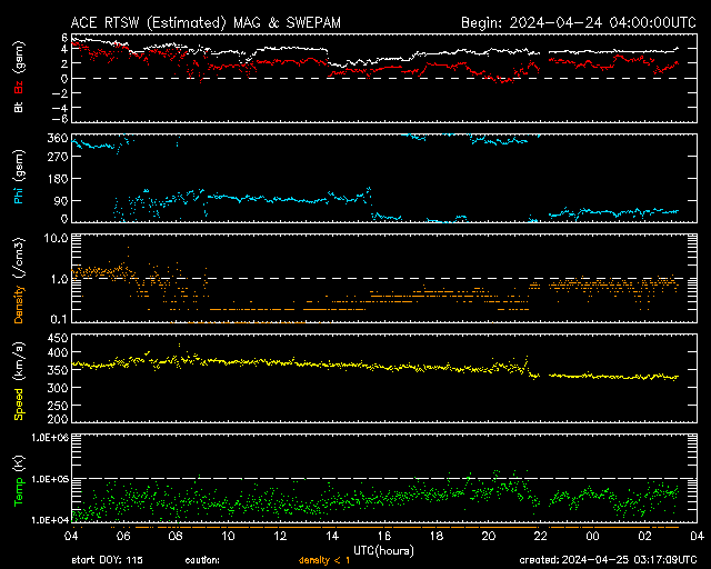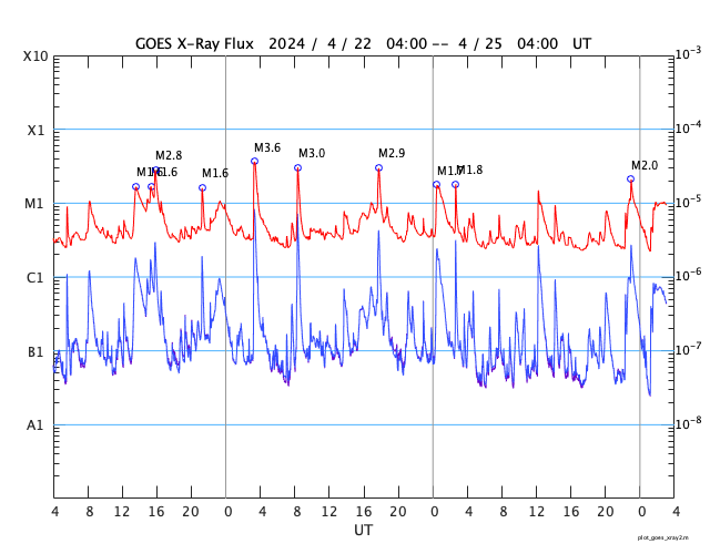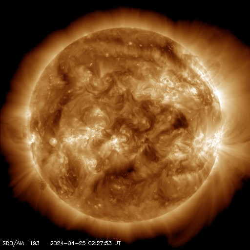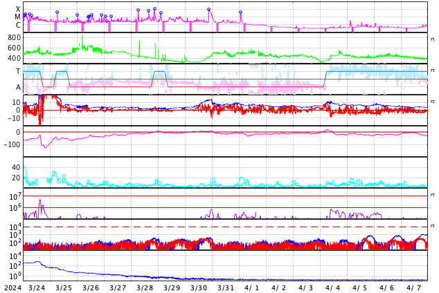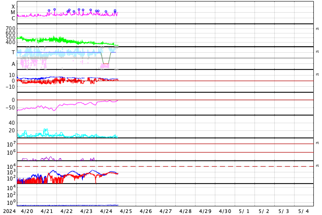 2024/ 4/25 12:20 更新 フレアの発生が続いています。太陽風は低速で、磁気圏は穏やかです。 担当 篠原 太陽では、フレアの発生が続いています。 南西の端(右下)に近付いた3645黒点群では、 C6.9、M1.4、M2.0などの小、中規模フレアが発生し、 北西側(右上)の3648群では、 C5.7、C4.0などの小規模フレアが発生しています。 全体として、西側の領域が活発で、 この後、これらが西の端に沈んで行くと、 太陽は穏やかになりそうです。 もうしばらく注目してください。 太陽風は、速度が330km/秒へ下がり、 更に低速になっています。 磁場強度は、3〜4nTとやや弱くなっています。 磁場の南北成分は、弱い北寄りになっています。 速度が下がっていることもあり、磁気圏は穏やかで、 AE指数は変化のない状態が続いています。 SDO衛星AIA193では、 注目していたコロナホールが西側に進んでいます。 広がりが小さいですが、 太陽風に影響は見られるでしょうか。 変化がなければ、 太陽風は、低速の穏やかな状態がしばらく続きそうです。