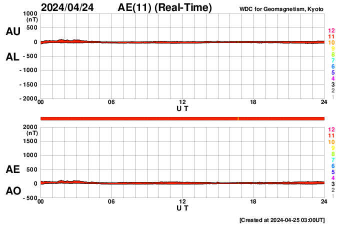 (c) SDO (NASA) ![]() SDO衛星による太陽の可視光写真。マウスの矢印を写真に重ねると、黒点番号付きの写真に切り替わります。 (c) SDO (NASA) ![]() GOES衛星の太陽X線強度。赤・橙 = 0.1〜0.8 nm、青・紫 = 0.05〜0.4 nm (c) データ:NOAA/SWPC、作図:宇宙天気ニュース ![]() ACEが観測した太陽風の磁場(1番上の枠、白線は全体の強度、赤線は南北成分) および、太陽風の密度(3番目の橙線)、速度(4番目の黄線) (c) NOAA/SWPC ![]() AE指数(速報値) 下段のAEグラフの値が高くなると、オーロラ活動が活発化しています。 (c) 京都大学WDC ![]() ![]() 27日の太陽周期に合わせた図 太陽が同じ面を地球に向けていた27日前の変化から、今後を予想することができます。 (c) 作図:宇宙天気ニュース
