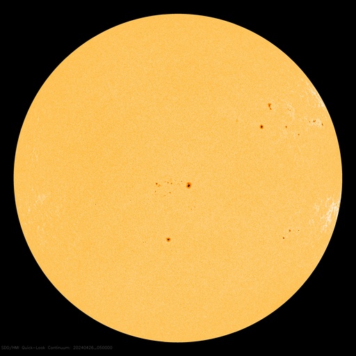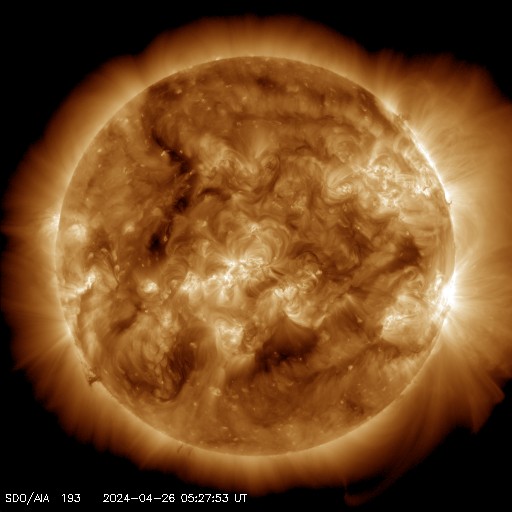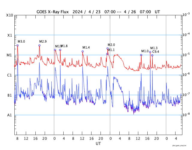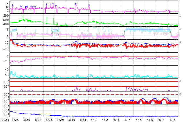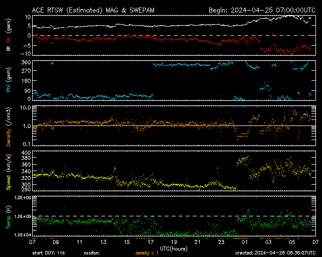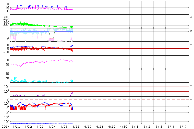 2024/ 4/26 15:38 更新 太陽は穏やかになっています。太陽風は低速です。 担当 篠原 太陽は、南西の端(右下)に達した3638黒点群で、 昨夜、25日22時(世界時25日13時)にM1.0、 今日未明、26日2時(世界時25日17時)にM1.3の 中規模フレアが発生しましたが、 以降は、C5.1、C3.5の小規模フレアが発生した程度で、 X線グラフの変化は少なくなっています。 3638群は西の端に沈んで見えなくなっているので、 この後の太陽は穏やかになりそうです。 太陽風は、300〜350km/秒と低速の風が続いています。 磁場強度は、5nTと平均的な状態でしたが、 グラフの最後で10nTへ強まる変化が発生しています。 ここで磁場が南向きに大きくなり、 -8nT程度の変化が発生しています。 しかし、速度が下がっているため影響は限定的で、 AE指数は、300nTくらいの 小規模の変化が起きている程度です。 磁場の南向きの強まりはどのくらい続くでしょうか。