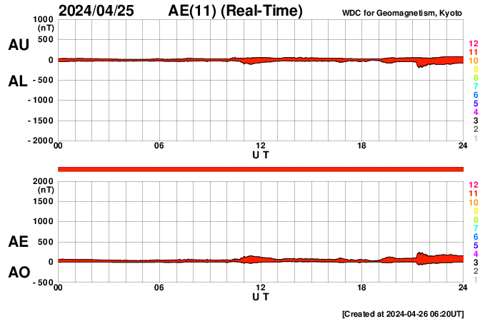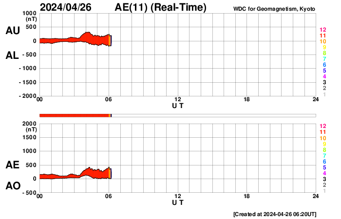 (c) SDO (NASA) ![]() SDO衛星による太陽の可視光写真。マウスの矢印を写真に重ねると、黒点番号付きの写真に切り替わります。 (c) SDO (NASA) ![]() GOES衛星の太陽X線強度。赤・橙 = 0.1〜0.8 nm、青・紫 = 0.05〜0.4 nm (c) データ:NOAA/SWPC、作図:宇宙天気ニュース ![]() ACEが観測した太陽風の磁場(1番上の枠、白線は全体の強度、赤線は南北成分) および、太陽風の密度(3番目の橙線)、速度(4番目の黄線) (c) NOAA/SWPC ![]() AE指数(速報値) 下段のAEグラフの値が高くなると、オーロラ活動が活発化しています。 (c) 京都大学WDC ![]() ![]() 27日の太陽周期に合わせた図 太陽が同じ面を地球に向けていた27日前の変化から、今後を予想することができます。 (c) 作図:宇宙天気ニュース