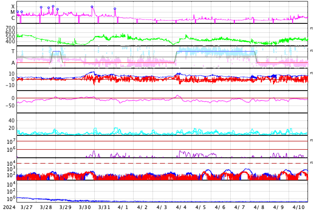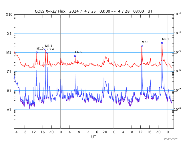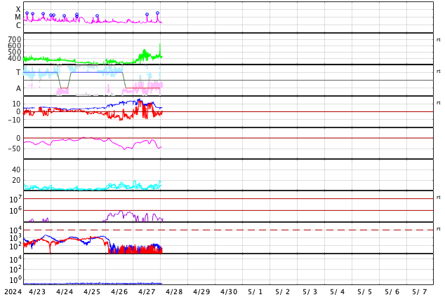 GOES衛星の太陽X線強度。赤・橙 = 0.1〜0.8 nm、青・紫 = 0.05〜0.4 nm (c) データ:NOAA/SWPC、作図:宇宙天気ニュース ![]() | ||||||||||||||||||||||||||||||||||||||||||||||||||||||||||||||||||||||||||||||||||||||||||||||||||||||||||||||||||||||||||||||||||||||||||||||||||||||||||||||||||||||||||||||||||||||||||||||||||||||||||||||||||||||||||||||||||||||||||||||||||||||||||||||||||||||||||||||