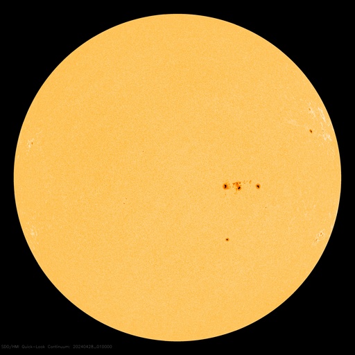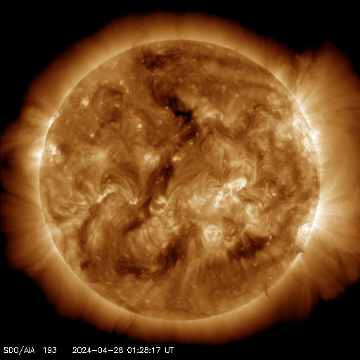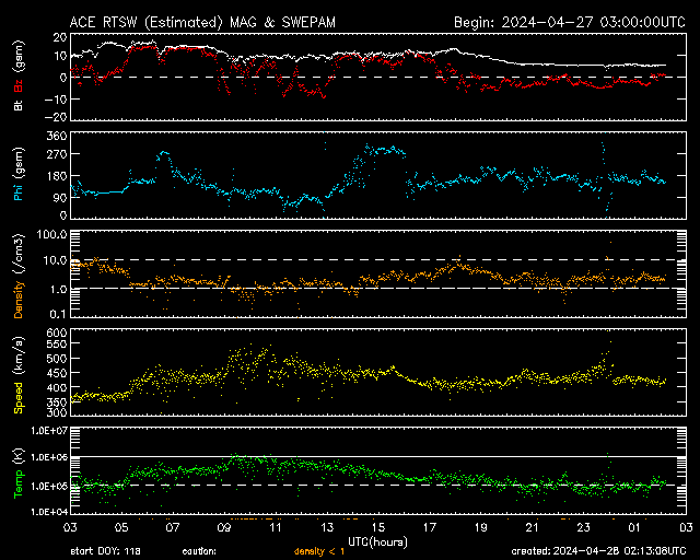 2024/ 4/28 11:11 更新 太陽風は平均的な状態に戻っています。 担当 篠原 太陽風の速度は、昨日の午後に400km/秒台へ上がり、 以降、430km/秒前後と平均的な速さになっています。 磁場強度は、10nT程度に強まった状態が 今日未明まで続きましたが、 その後低下して、現在は5nTと平均的な状態です。 太陽風磁場の南北成分は、 北を向いたり、南を向いたり、ゆっくり変化しています。 南向きになった頃に磁気圏の活動が強まり、 AE指数は、500〜800nTの中規模の変化が発生しています。 SDO衛星AIA193では、 北半球側に縦に細くコロナホールが見えています。 広がりは小さいですが、 3日後くらいに影響がやって来るでしょうか。 太陽は、中心部西側(右側)の3654黒点群で、 M2.1とM3.0の中規模フレアが発生しています。 この後も活動は続くでしょうか。 ![]() SDO衛星のAIA193カメラによる太陽コロナの様子 (c) SDO (NASA) ![]() SDO衛星による太陽の可視光写真。マウスの矢印を写真に重ねると、黒点番号付きの写真に切り替わります。 (c) SDO (NASA) ![]() ACEが観測した太陽風の磁場(1番上の枠、白線は全体の強度、赤線は南北成分) および、太陽風の密度(3番目の橙線)、速度(4番目の黄線) (c) NOAA/SWPC ![]() AE指数(速報値) 下段のAEグラフの値が高くなると、オーロラ活動が活発化しています。 (c) 京都大学WDC ![]() ![]() 27日の太陽周期に合わせた図 太陽が同じ面を地球に向けていた27日前の変化から、今後を予想することができます。 (c) 作図:宇宙天気ニュース