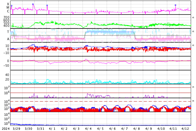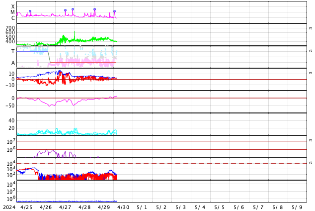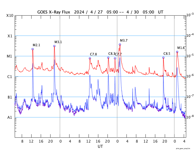 GOES衛星の太陽X線強度。赤・橙 = 0.1〜0.8 nm、青・紫 = 0.05〜0.4 nm (c) データ:NOAA/SWPC、作図:宇宙天気ニュース ![]() | ||||||||||||||||||||||||||||||||||||||||||||||||||||||||||||||||||||||||||||||||||||||||||||||||||||||||||||||||||||||||||||||||||||||||||||||||||||||||||||||||||||||||||||||||||||||||||||||||||||||||||||||||||||||||||||||||||||||||||||||||||||||||||||||||||||