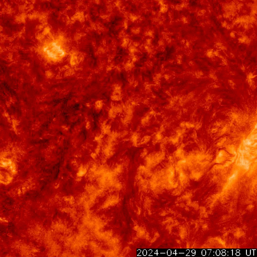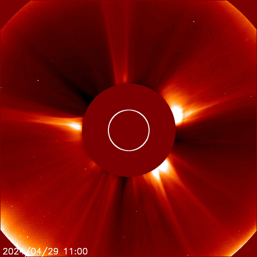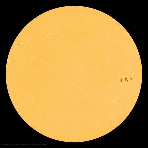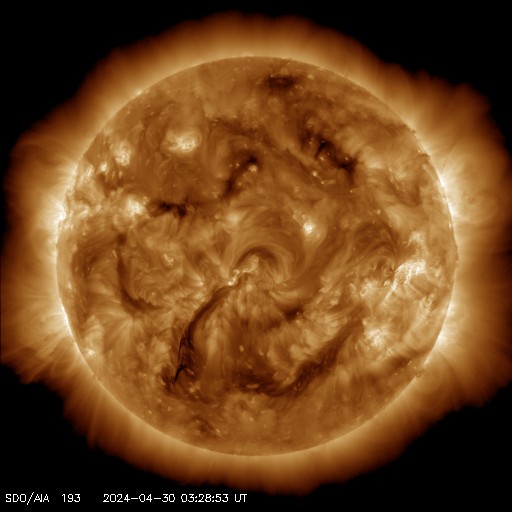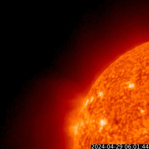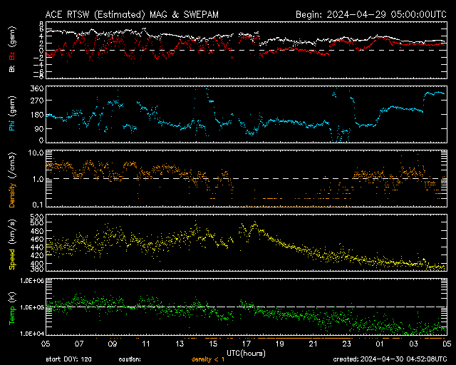 2024/ 4/30 13:56 更新 太陽風は平均的な速度です。磁気圏は穏やかです。 担当 篠原 太陽風は、速度が450km/秒から400km/秒へ少し下がっています。 平均的な状態です。 磁場強度は5nTから2nTへ下がり、弱くなっています。 磁場の南北成分は、 0nT付近か、やや北寄りで推移しています。 磁気圏は穏やかで、 AE指数は時々小規模の変化が起きている程度です。 SDO衛星AIA193では、 北半球の小さいコロナホールが西側(右側)に進んでいます。 太陽風に影響が見られるでしょうか。 太陽は、南西側(右下)の3654黒点群で、 今朝早くにC8.5の小規模フレア、 30日10時(世界時30日1時)にM1.6の中規模フレアが 発生しています。 活動は続いていますが、強まる様子はありません。 また、昨夕、29日18時半(世界時29日9時半)頃に、 中心部でフィラメント噴出が発生しています。 SDO衛星AIA304の動画を掲載します。 薄暗いガスが右上へ飛び出す様子が見えています。 SOHO衛星LASCO C2、C3では、 右上と右下に向かって飛び出すCME(コロナ質量放出)が 観測されています。 どちらが関係する噴出かはっきりしないのですが、 横向きに飛び出している様なので、 地球への影響はなさそうです。 この噴出の少し前、29日16時(世界時29日7時)には、 北東の端(左上)でプロミネンス噴出が発生しています。 GOES衛星SUVI 304の動画を掲載します。 噴き上がり方がきれいです。 太陽の可視光写真は、黒点がだいぶ少なくなっています。 一週間くらい前は、 群番号を記入するのも大変だったのですが、 今日は5群程度です。