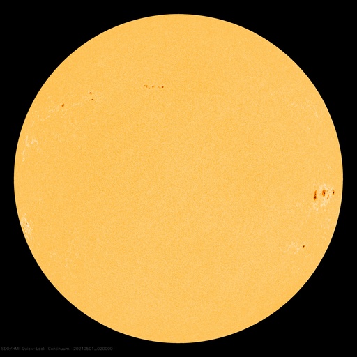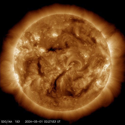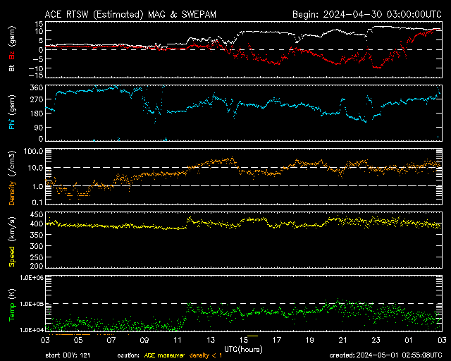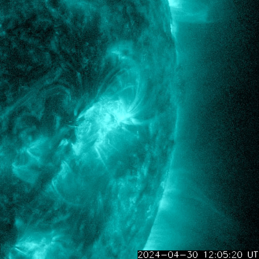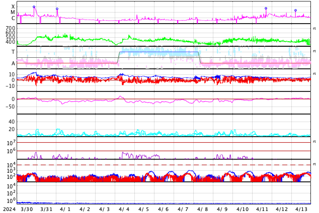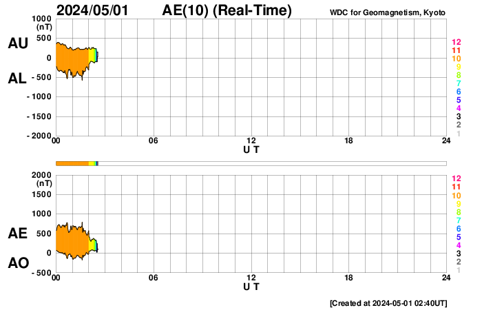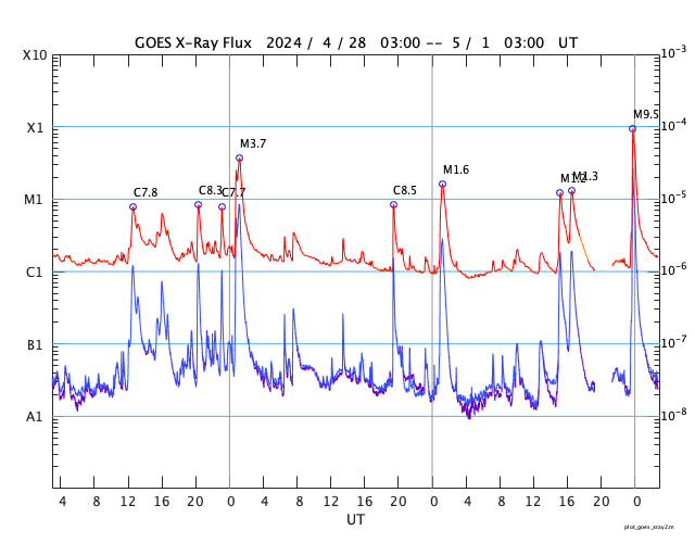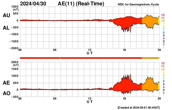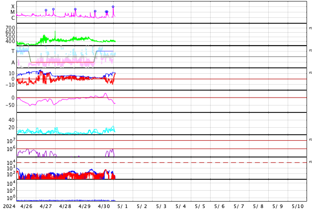 2024/ 5/ 1 11:57 更新 M9.5の中規模フレアが発生しました。太陽風磁場が南向きに強まりました。 担当 篠原 太陽で、西の端(右端)に近付いた3654黒点群の活動が続いています。 今日未明、1日0時(世界時4月30日15時)にM1.2、 1日1時(世界時4月30日16時)にM1.3と中規模フレアを起こし、 今朝、1日8時半(世界時4月30日23時半)には、 M9.5とXクラス寸前のフレアを起こしています。 SDO衛星AIA131による、 これらの中規模フレアの動画を掲載します。 太陽の他の領域では、 北東(左上)の3961群で小さいCクラスのフレアが発生しています。 太陽風は、速度は400km/秒前後と 平均的な状態が続いていますが、 磁場強度は、2nTと弱い状態から、 5nT、10nT、12nTと段階的な強まりが到来しています。 小規模のCME(コロナ質量放出)による乱れが 到来しているのかもしれません。 グラフの中盤から磁場の南北成分が南向きに強まり、 -5nT〜 -10nTの変化が今朝まで続いています。 このため、磁気圏の活動も高まって、 AE指数では、1000nTに達する大きい変化が発生しています。 現在の太陽風は、磁場は北向きに切り替わっています。 この傾向が続くと磁気圏の活動は静かになるでしょう。 太陽風磁場の強まりがどこまで続くか、 この後も注目してください。