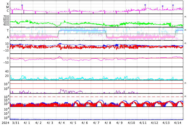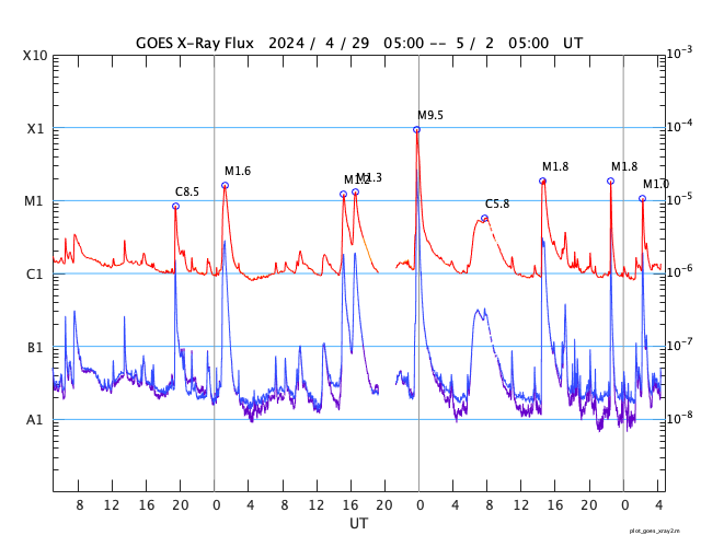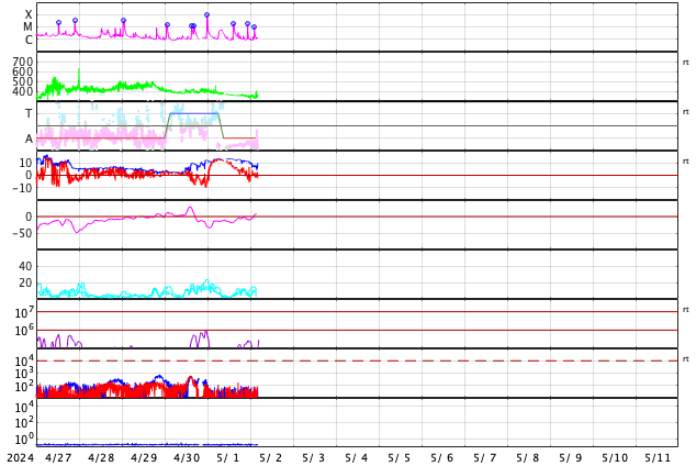 GOES衛星の太陽X線強度。赤・橙 = 0.1〜0.8 nm、青・紫 = 0.05〜0.4 nm (c) データ:NOAA/SWPC、作図:宇宙天気ニュース ![]() | ||||||||||||||||||||||||||||||||||||||||||||||||||||||||||||||||||||||||||||||||||||||||||||||||||||||||||||||||||||||||||||||||||||||||||||||||||||||||||||||||||||||||||||||||||||||||||||||||||||||||||||||||||||||||||||||||||||||||||||||||||||||||