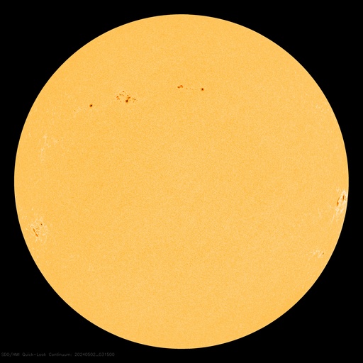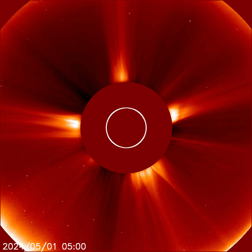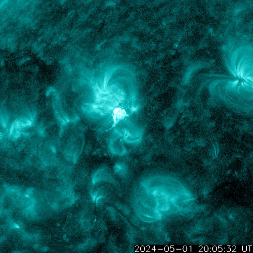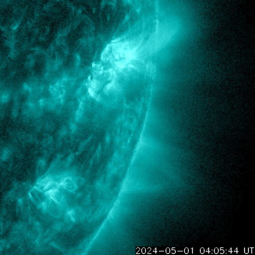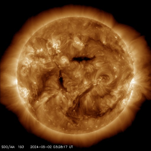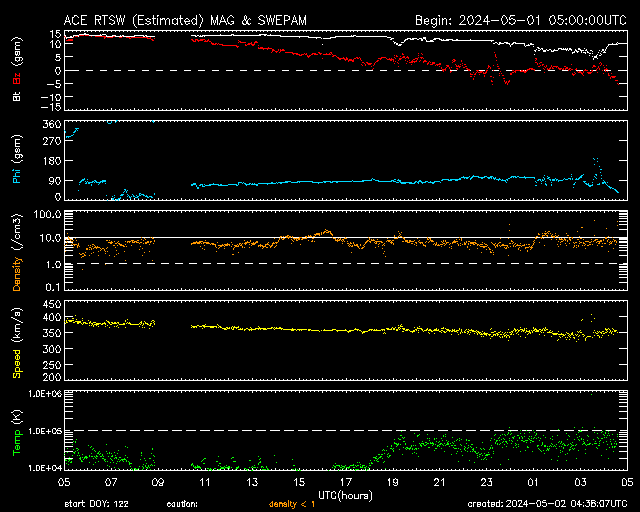 2024/ 5/ 2 13:31 更新 太陽風磁場はやや強まった状態です。磁気圏は穏やかです。 担当 篠原 太陽風は、速度が400km/秒から350km/秒へ下がり、 低速になっています。 一方、13nTに強まっていた磁場強度は、 今朝くらいに一旦10nTを割りましたが、 グラフの最後で再び10nTに強まっています。 この後はどの様に推移するでしょうか。 磁場の南北成分は、 今朝までは北向きの状態が続き、 以降は0nT付近で小さく変化しています。 グラフの前半では10nTを超えていましたが、 北向きのため磁気圏への影響は小さく、 AE指数は変化のない状態が続いています。 SDO衛星AIA193では、 中心部の北側に小さいコロナホールが見えています。 2〜3日後くらいに、太陽風速度の高まりが見られるでしょうか。 太陽では、1日15時(世界時1日6時)に、 南西(右下)の3654黒点群の南側で C5.8の小規模フレアが発生しました。 SDO衛星AIA131の動画を掲載します。 広い領域がゆっくりと光っていて、 X線グラフでも時間の長い高まりになっています。 SOHO衛星LASCO C2、C3では、 太陽の右下へ広がるCME(コロナ質量放出)が観測されています。 横向きに近い噴出ですが、 3日後くらいに弱い影響がやって来るかもしれません。 また、今朝、2日7時半(世界時1日22時半)にM1.8、 2日11時(世界時2日2時)にM1.0と、 中規模フレアが2回、北東側(左上)の3663群で発生しています。 この後の活動に注目してください。