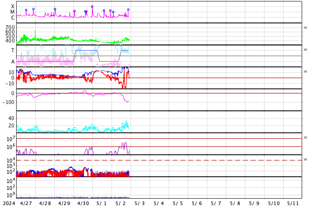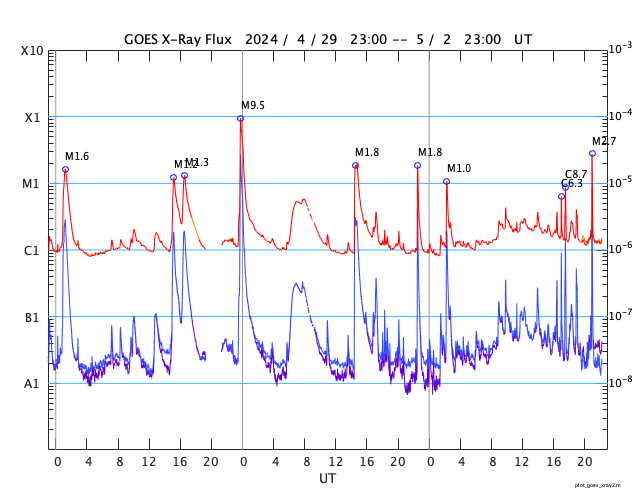 GOES衛星の太陽X線強度。赤・橙 = 0.1〜0.8 nm、青・紫 = 0.05〜0.4 nm (c) データ:NOAA/SWPC、作図:宇宙天気ニュース ![]() | ||||||||||||||||||||||||||||||||||||||||||||||||||||||||||||||||||||||||||||||||||||||||||||||||||||||||||||||||||||||||||||||||||||||||||||||||||||||||||||||||||||||||||||||||||||||||||||||||||||||||||||||||||||||||||||||||||||||||||||||||||||||||||||||||||||||||