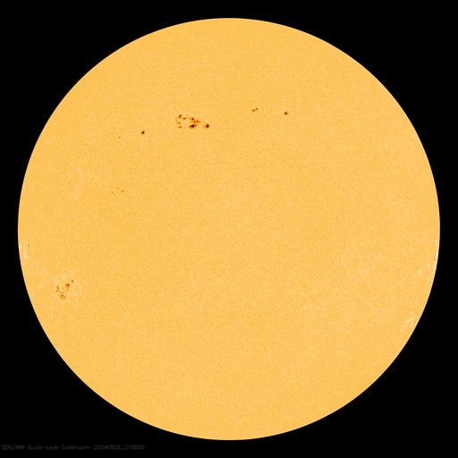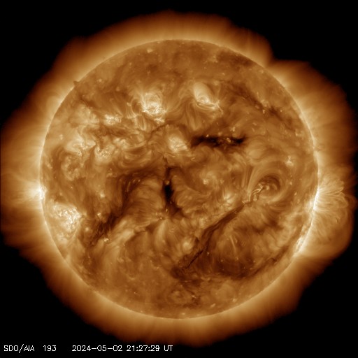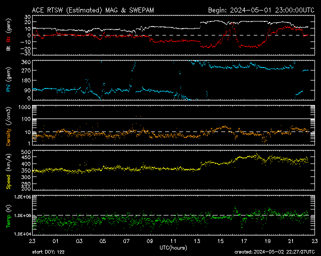 2024/ 5/ 3 07:27 更新 太陽風磁場が南向きに強まり、磁気圏の活動が強まりました。 担当 篠原 太陽風の磁場の強まりが続いています。 昨日のニュース以降も10nT近い強まりが続いていましたが、 2日22時半(世界時2日13時半)頃に、 20nTに達する強まりが到来しています。 速度も高まる変化が見られ、 350km/秒と低速の状態から、 平均的な速度ですが、400〜450km/秒へ変化しています。 注目は磁場の南北成分で、 グラフの中程から-10nTくらいの南向きになり、 上記の磁場の強まり以降は、 -17nTの強まりが全体で4時間程発生しています。 このため磁気圏の活動も強まって、 AE指数は、1000〜1700nTの大きい変化が 半日近く続いています。 また、Dst指数の速報値は -101nTまで下がっていて、 中規模の磁気嵐になっています。 現在の太陽風は、 磁場強度はまだ強まった状態ですが、値は10nTに下がり、 南北成分は北向きに切り替わっています。 AE指数も最後は変化がなくなっていて、 太陽風磁場がこの状態で推移すると、 磁気圏は穏やかになるでしょう。 太陽は、昨夕から南東(左下)の3664黒点群の活動が強まり、 C4.3、C3.6、C3.7、C6.3、C8.7など、 Cクラスの小規模フレアを次々に起こし、 今朝、3日6時(世界時2日21時)に、 M2.7の中規模フレアが発生しました。 この後の活動に注目して下さい。 ![]() Dst指数(速報値)は、-101nTまで下がっています。 (c) 京都大学WDC ![]() SDO衛星のAIA193カメラによる太陽コロナの様子 (c) SDO (NASA) ![]() SDO衛星による太陽の可視光写真。マウスの矢印を写真に重ねると、黒点番号付きの写真に切り替わります。 (c) SDO (NASA) ![]() ACEが観測した太陽風の磁場(1番上の枠、白線は全体の強度、赤線は南北成分) および、太陽風の密度(3番目の橙線)、速度(4番目の黄線) (c) NOAA/SWPC ![]() AE指数(速報値) 下段のAEグラフの値が高くなると、オーロラ活動が活発化しています。 (c) 京都大学WDC ![]() 27日の太陽周期に合わせた図 太陽が同じ面を地球に向けていた27日前の変化から、今後を予想することができます。 (c) 作図:宇宙天気ニュース