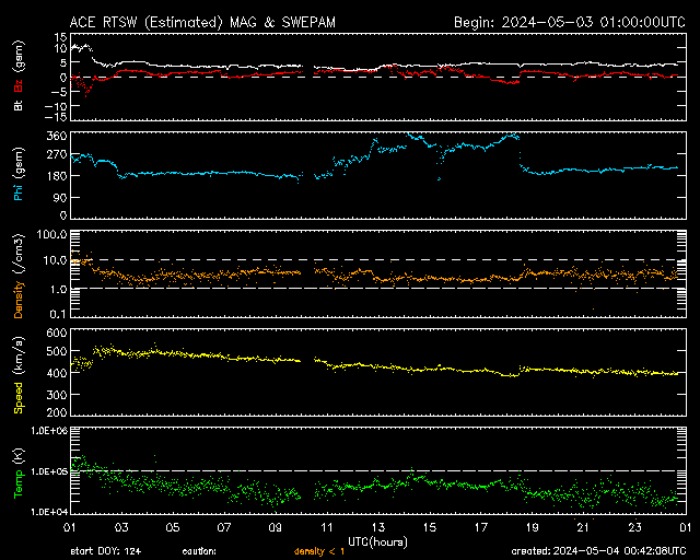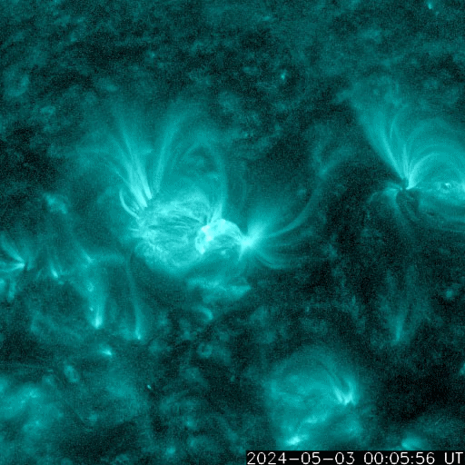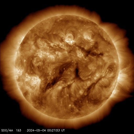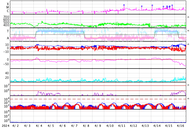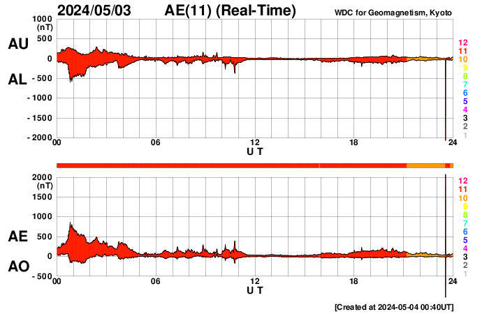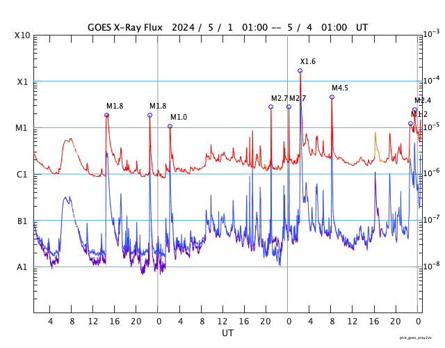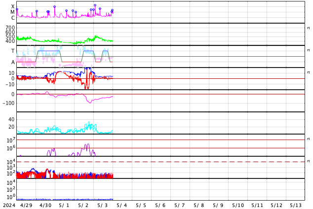 2024/ 5/ 4 09:43 更新 X1.6の大規模フレアが発生しました。太陽風は平均的な状態です。 担当 篠原 太陽の中心部北側(上側)の3663黒点群で、 昨日の昼、3日11時(世界時3日2時)に、 X1.6の大規模フレアが発生しました。 Xクラスのフレアの発生は、 世界時3月28日のX1.1以来で、1か月ぶりです。 SDO衛星AIA131の動画を掲載します。 3663群では、昨夕、3日17時(世界時3日8時)にM4.4、 今朝、4日8時半(世界時3日23時半)にM2.4と、 中規模フレアが続いています。 黒点も大きい姿を保っています。 引き続き注目してください。 太陽風は、昨日のニュースの後に、 速度が500km/秒まで高まりましたが、 その後はゆっくりと低下して、 現在は400km/秒と平均的な状態です。 磁場強度は、10nTから4nTへ下がり、 以降、平均的な状態が続いています。 磁場の南北成分は、0nT付近か、弱い北寄りです。 磁気圏は穏やかになっていて、 AE指数は小さい変化が見られる程度です。 ![]() 3663黒点群で発生したX1.6の大規模フレア。 (c) SDO衛星AIA131 (NASA)、(動画加工 : 宇宙天気ニュース) ![]() 3663黒点群で発生したM4.4の中規模フレア。 (c) SDO衛星AIA131 (NASA)、(動画加工 : 宇宙天気ニュース) ![]() SDO衛星のAIA193カメラによる太陽コロナの様子 (c) SDO (NASA) ![]() SDO衛星による太陽の可視光写真。マウスの矢印を写真に重ねると、黒点番号付きの写真に切り替わります。 (c) SDO (NASA) ![]() GOES衛星の太陽X線強度。赤・橙 = 0.1〜0.8 nm、青・紫 = 0.05〜0.4 nm (c) データ:NOAA/SWPC、作図:宇宙天気ニュース ![]() ACEが観測した太陽風の磁場(1番上の枠、白線は全体の強度、赤線は南北成分) および、太陽風の密度(3番目の橙線)、速度(4番目の黄線) (c) NOAA/SWPC ![]() AE指数(速報値) 下段のAEグラフの値が高くなると、オーロラ活動が活発化しています。 (c) 京都大学WDC ![]() ![]() 27日の太陽周期に合わせた図 太陽が同じ面を地球に向けていた27日前の変化から、今後を予想することができます。 (c) 作図:宇宙天気ニュース