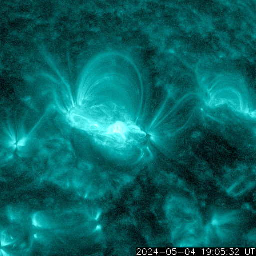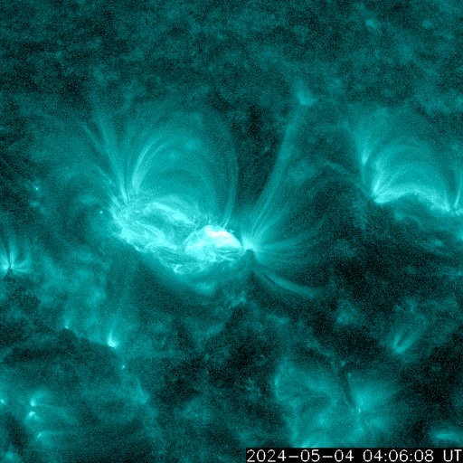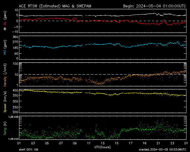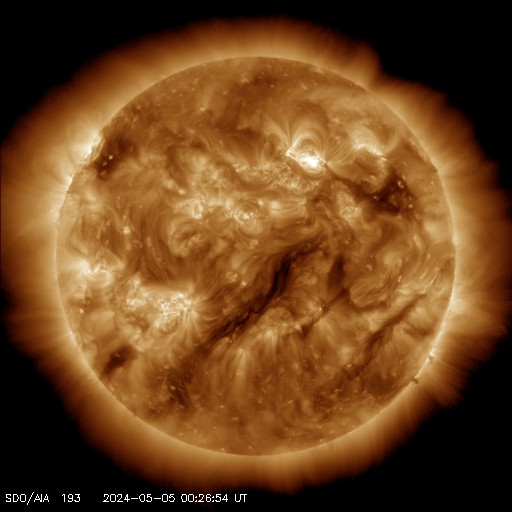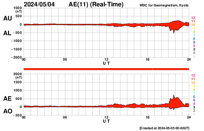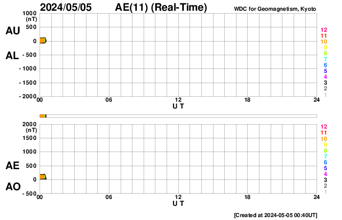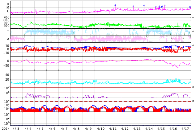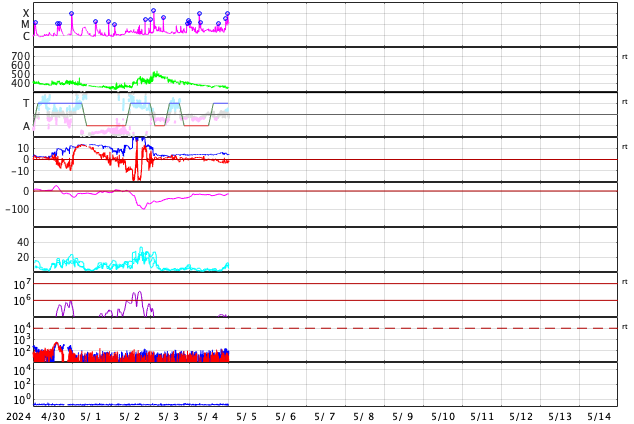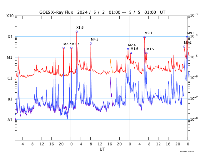 2024/ 5/ 5 09:53 更新 3663黒点群でMクラスのフレアが続いています。太陽風は低速になっています。 担当 篠原 太陽の中心部北西側(右上)の3663黒点群で、 Mクラスの中規模フレアの発生が続いています。 昨日の午後、4日15時(世界時4日6時)にM9.1、 4日16時(世界時4日7時)にM1.5、 今日未明、5日3時(世界時4日18時)にM1.3、 今朝、5日7時半(世界時4日22時半)にM3.2、 そして、5日8時半(世界時4日23時半)にM9.0です。 昨日の午後と今朝の活動の様子を、 SDO衛星AIA131の動画で紹介します。 3663群では、 Cクラスの小規模フレアも多数発生しています。 引き続き注目してください。 太陽風は、速度が350km/秒へ下がり、 低速になっています。 磁場強度は、5nT前後と平均的な状態です。 磁場の南北成分は、 グラフの後半で弱い南寄りになっています。 このため磁気圏の活動も少し強まって、 AE指数に700nTの中規模の変化が発生しています。 速度が下がっているので影響は限定的ですが、 磁場の南寄りの傾向が続くと、 磁気圏の活動がやや高まった状態が続くでしょう。