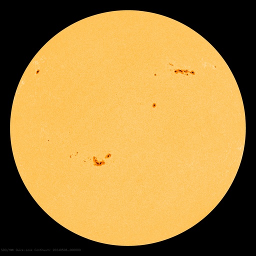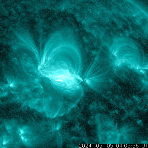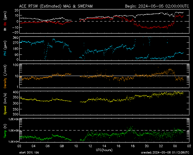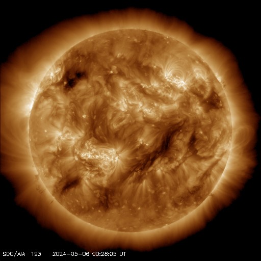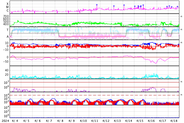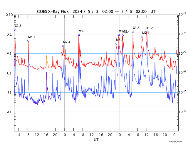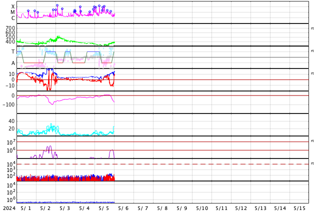 2024/ 5/ 6 10:11 更新 Xクラスの大規模フレアが2回発生しました。 担当 篠原 昨日のニュース以降も3663黒点群の活発な活動は続き、 5日15時(世界時5日6時)にX1.3、 5日20時半(世界時5日11時半)にX1.2と、 Xクラスの大規模フレアが2回。 その前後に、M8.4、M1.3、M7.4、M1.3、M2.2、M1.3と、 中規模フレアも多く発生しています。 2つのXフレアの様子を、 SDO衛星AIA131の動画で紹介します。 X線グラフを見ると、フレアの規模は次第に下がっています。 この後、3663群の活動は落ち着くのか、 しばらく休んで再び高まるのか、 引き続き注目してください。 中心部南東(左下)の3664黒点群でも、 M2.3、M1.3、M1.0と中規模フレアが発生しています。 その左側の3668群でも小さい活動が起きています。 この後、活動の強まりが見られるでしょうか。 太陽風は、5nT前後と平均的な状態だった磁場強度が、 昨夜からゆっくり上昇して、現在は15nTに強まっています。 速度は、320km/秒と低速でしたが、 磁場の強まりとともに少し上昇して、 現在は380km/秒とやや低速程度になっています。 磁場の南北成分は、 グラフの後半、今日未明から今朝にかけて、 -10nTに達する強い南向きが発生しています。 このため、磁気圏の活動がある程度強まり、 AE指数は、800nTの中規模の変化が発生しています。 現在は磁場は北向きに切り替わっているので、 この後は、磁気圏は穏やかになるでしょう。 この後、太陽風はどの様に変化するでしょうか。