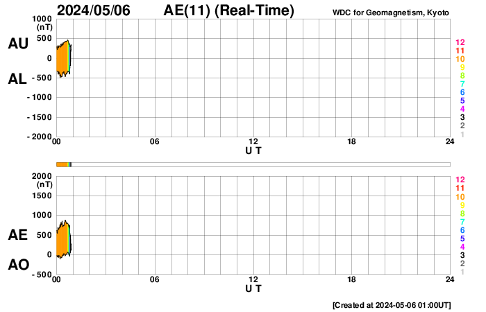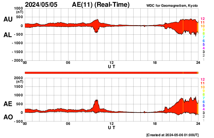 (c) SDO衛星AIA131 (NASA)、(動画加工 : 宇宙天気ニュース) ![]() SDO衛星のAIA193カメラによる太陽コロナの様子 (c) SDO (NASA) ![]() SDO衛星による太陽の可視光写真。マウスの矢印を写真に重ねると、黒点番号付きの写真に切り替わります。 (c) SDO (NASA) ![]() GOES衛星の太陽X線強度。赤・橙 = 0.1〜0.8 nm、青・紫 = 0.05〜0.4 nm (c) データ:NOAA/SWPC、作図:宇宙天気ニュース ![]() ACEが観測した太陽風の磁場(1番上の枠、白線は全体の強度、赤線は南北成分) および、太陽風の密度(3番目の橙線)、速度(4番目の黄線) (c) NOAA/SWPC ![]() AE指数(速報値) 下段のAEグラフの値が高くなると、オーロラ活動が活発化しています。 (c) 京都大学WDC ![]() ![]() 27日の太陽周期に合わせた図 太陽が同じ面を地球に向けていた27日前の変化から、今後を予想することができます。 (c) 作図:宇宙天気ニュース
