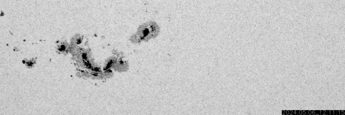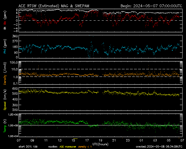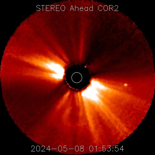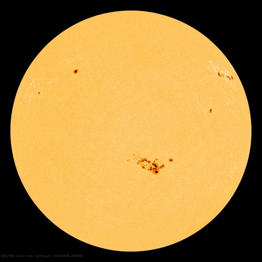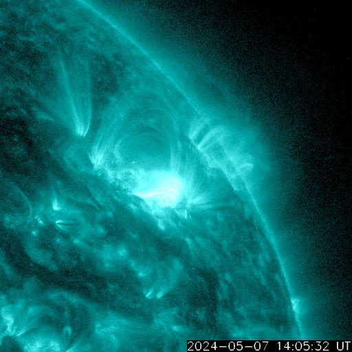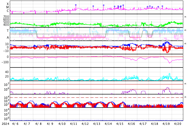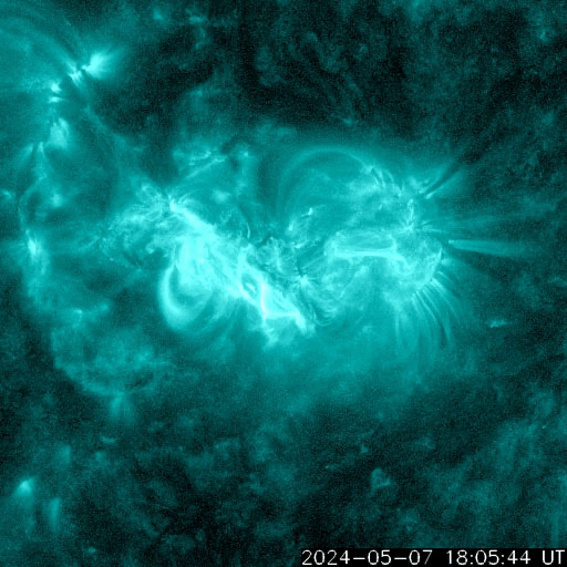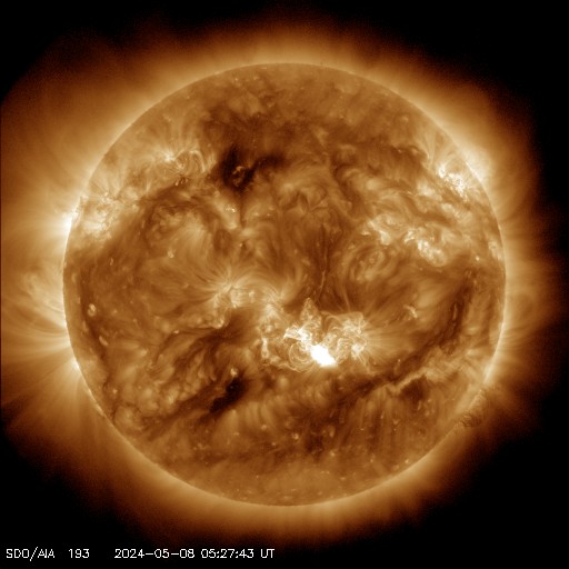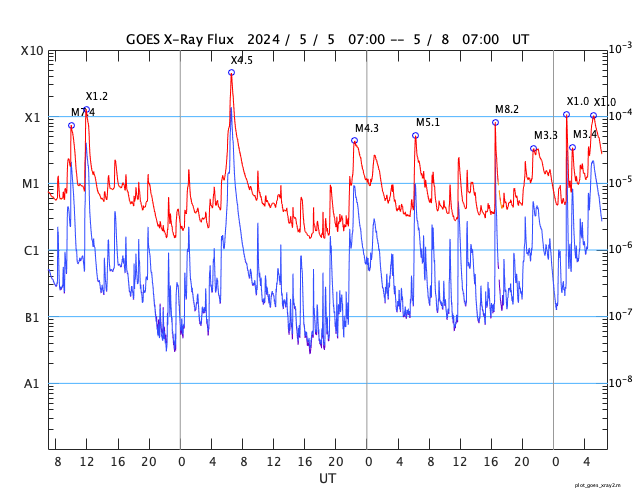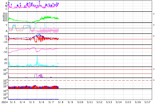 2024/ 5/ 8 15:31 更新 X1.0の大規模フレアが2か所で発生しています。 担当 篠原 太陽の北西の端(右上)に近付いた3663黒点群で、 フレアの発生が続いています。 昨日のニュース以降も、 7日15時(世界時7日6時)のM5.1から、 M1.5、M1.0、M8.2、M3.3と中規模フレアが続き、 8日10時半(世界時8日1時半)には、 X1.0の大規模フレアが発生しました。 M8.2からX1.0にかけての活動の様子を、 SDO衛星AIA131の動画で紹介します。 3663群は、次第に西の端に近付きます。 向こう側に回るまでに、どの様な活動を起こすでしょうか。 一方、中心部南側(下側)では、 3664群と3668群が重なる様に大きな姿になっています。 この1日半の黒点変化をSDO衛星の可視光写真の動画で紹介します。 特に、左側の3668群の変化が目立ちます。 これらの領域ではフレアの発生も増えていて、 昨日のニュース以降、 M1.3、M2.4、M2.1、M3.2、M3.4と中規模フレアが続き、 8日13時半(世界時8日4時半)に、 X1.0と大規模フレアも発生しています。 M2.1からX1.0にかけてのフレアの様子を、 SDO衛星AIA131の動画で紹介します。 STEREO Ahead衛星COR2のコロナグラフによると、 3664群のX1.0大規模フレアに伴って、 CME(コロナ質量放出)が太陽の右下寄りに発生している様です。 CMEが地球の方向にも広がっていれば、 明後日、10日頃に太陽風の乱れがやって来るかもしれません。 この後、SOHO衛星の画像などに注目してください。 太陽風は、速度が540km/秒から470km/秒に下がり、 やや高速くらいになっています。 磁場強度も5nTから4nTに少し下がっています。 こちらは平均的な状態です。 AE指数は、グラフの途中で 200〜500nTの変化が発生していますが、 最後は変化がなくなって、磁気圏は穏やかになっています。 ![]() 3663黒点群で発生したX1.0などのフレアの様子。 (c) SDO衛星AIA131 (NASA)、(動画加工 : 宇宙天気ニュース) ![]() 3664群(右)と3668群(左)の1日半の変化。 (c) SDO衛星HMII (NASA)、(動画加工 : 宇宙天気ニュース) ![]() 3664黒点群で発生したX1.0などのフレアの様子。 (c) SDO衛星AIA131 (NASA)、(動画加工 : 宇宙天気ニュース) ![]() 太陽の右下にCMEが飛び出している様です。 (c) STEREO Ahead衛星COR2 (NASA)、(動画加工 : 宇宙天気ニュース) ![]() SDO衛星のAIA193カメラによる太陽コロナの様子 (c) SDO (NASA) ![]() SDO衛星による太陽の可視光写真。マウスの矢印を写真に重ねると、黒点番号付きの写真に切り替わります。 (c) SDO (NASA) ![]() GOES衛星の太陽X線強度。赤・橙 = 0.1〜0.8 nm、青・紫 = 0.05〜0.4 nm (c) データ:NOAA/SWPC、作図:宇宙天気ニュース ![]() ACEが観測した太陽風の磁場(1番上の枠、白線は全体の強度、赤線は南北成分) および、太陽風の密度(3番目の橙線)、速度(4番目の黄線) (c) NOAA/SWPC ![]() AE指数(速報値) 下段のAEグラフの値が高くなると、オーロラ活動が活発化しています。 (c) 京都大学WDC ![]() ![]() 27日の太陽周期に合わせた図 太陽が同じ面を地球に向けていた27日前の変化から、今後を予想することができます。 (c) 作図:宇宙天気ニュース