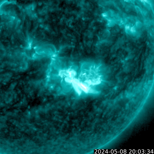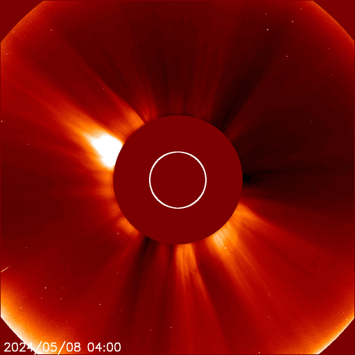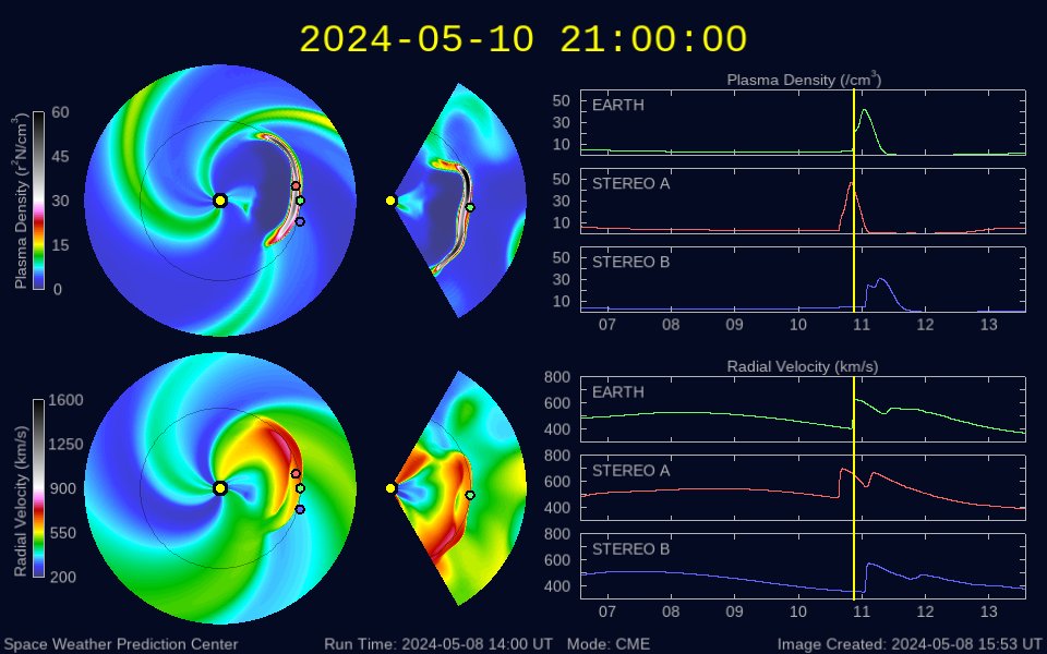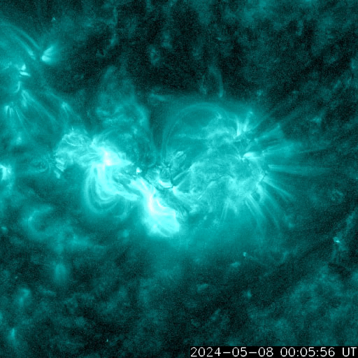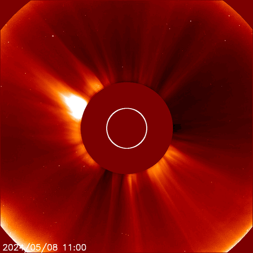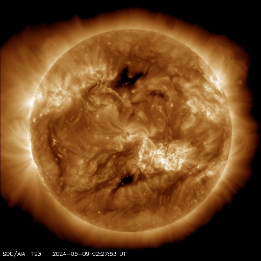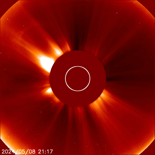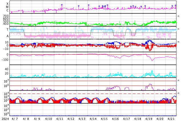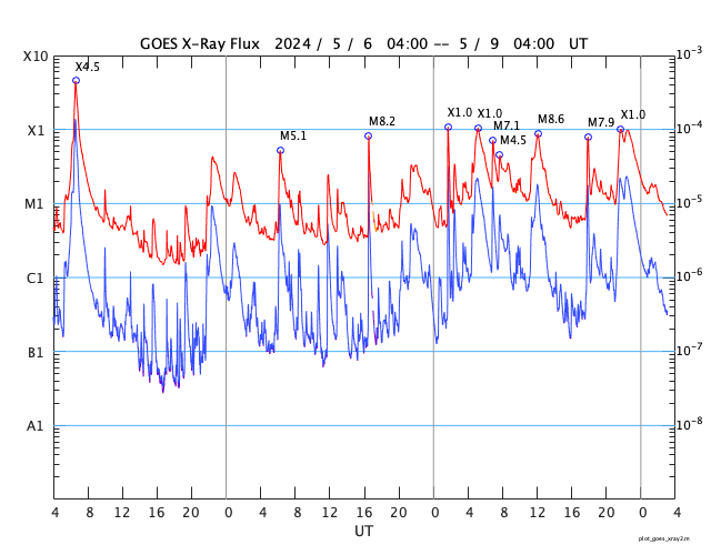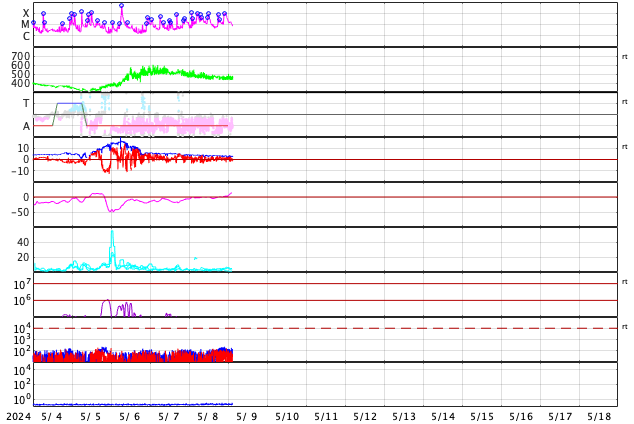 2024/ 5/ 9 12:19 更新 3664黒点群でフレアが続き、ハロー型のCMEも続いています。 担当 篠原 太陽の中心部南西側(右下)の3664黒点群で、 フレアの発生が続いています。 昨日紹介した8日13時半(世界時8日4時半)の X1.0の大規模フレアの後も、 8日16時(世界時8日7時)にM7.1、 8日21時(世界時8日12時)にM8.6などの 中規模フレアを起こしています。 X1.0を含めたこれらのフレアの様子を、 SDO衛星AIA131の動画で紹介します。 X1.0のフレアでは、太陽を囲む様に広がる ハロー型のCME(コロナ質量放出)が発生しています。 SOHO衛星LASCO C2、C3の動画を掲載します。 NOAA/SWPCの太陽風予報によると、 太陽風の乱れは、明後日の朝、 11日6時(世界時10日21時)頃に 地球に到来する可能性があります。 注目してください。 また、1枚目の動画のM8.6フレアの時にも、 ハロー型のCMEが発生しています。 SOHO衛星LASCO C2、C3の動画では、 1つめよりは淡いですが、 丸くコロナのガスが広がる様子が見えています。 3664黒点群の活動は更に続いて、 今日未明、9日2時半(世界時8日17時半)に M7.9の中規模フレアを起こし、 今朝、9日6時(世界時8日21時)にX1.0の大規模フレア、 9日7時(世界時8日22時)にM9.8と 大きい中規模フレアが発生しています。 今朝のフレアの様子を、 GOES衛星SUVI 131の動画で紹介します。 このフレアでもハロー型のCMEが発生しています。 このため、最初のCMEの後も、 次々に太陽風の乱れが到来することになりそうです。 10日の午後から12日にかけて、 太陽風や磁気圏の変化に注目してください。 太陽風の速度は、 470km/秒から460km/秒へ少し下がっています。 平均的な状態です。 磁場強度も4nTから3nTへ少し下がり、 やや弱い状態になっています。 磁場の南北成分は、0nT付近で小さく変化しています。 磁気圏は穏やかで、AE指数はほとんど変化のない状態です。 ![]() 3664黒点群で発生した、X1.0、M7.1、M8.6フレアの様子。 (c) SDO衛星AIA131 (NASA)、(動画加工 : 宇宙天気ニュース) ![]() X1.0フレアに伴って発生したCME。太陽を囲む様に広がっています。 (c) SOHO衛星LASCO C2、C3 (ESA & NASA)、(動画加工 : 宇宙天気ニュース) ![]() 太陽風の乱れは、11日6時(世界時10日21時)頃に地球に到来する可能性があります。 (c) NOAA/SWPC ![]() M8.6フレアに伴って発生したハロー型のCME。 (c) SOHO衛星LASCO C2、C3 (ESA & NASA)、(動画加工 : 宇宙天気ニュース) ![]() 3664黒点群で発生した、X1.0、M9.8フレアの様子。 (c) GOES衛星SUVI 131 (NOAA)、(動画加工 : 宇宙天気ニュース) ![]() ハロー型のCMEが発生しています。 (c) SOHO衛星LASCO C2、C3 (ESA & NASA)、(動画加工 : 宇宙天気ニュース) ![]() SDO衛星のAIA193カメラによる太陽コロナの様子 (c) SDO (NASA) ![]() SDO衛星による太陽の可視光写真。マウスの矢印を写真に重ねると、黒点番号付きの写真に切り替わります。 (c) SDO (NASA) ![]() GOES衛星の太陽X線強度。赤・橙 = 0.1〜0.8 nm、青・紫 = 0.05〜0.4 nm (c) データ:NOAA/SWPC、作図:宇宙天気ニュース ![]() ACEが観測した太陽風の磁場(1番上の枠、白線は全体の強度、赤線は南北成分) および、太陽風の密度(3番目の橙線)、速度(4番目の黄線) (c) NOAA/SWPC ![]() AE指数(速報値) 下段のAEグラフの値が高くなると、オーロラ活動が活発化しています。 (c) 京都大学WDC ![]() ![]() 27日の太陽周期に合わせた図 太陽が同じ面を地球に向けていた27日前の変化から、今後を予想することができます。 (c) 作図:宇宙天気ニュース