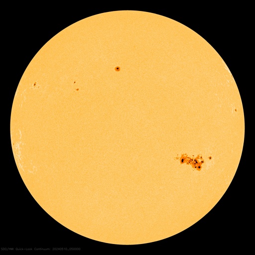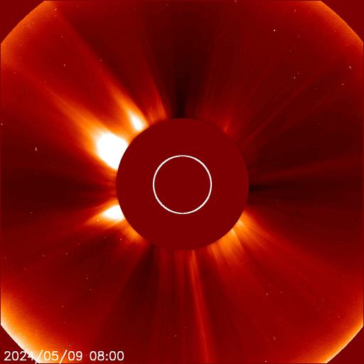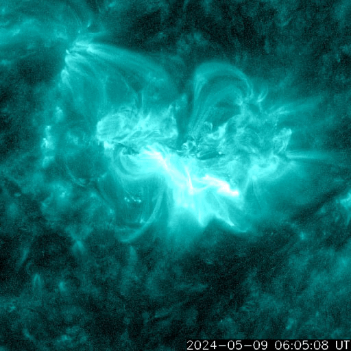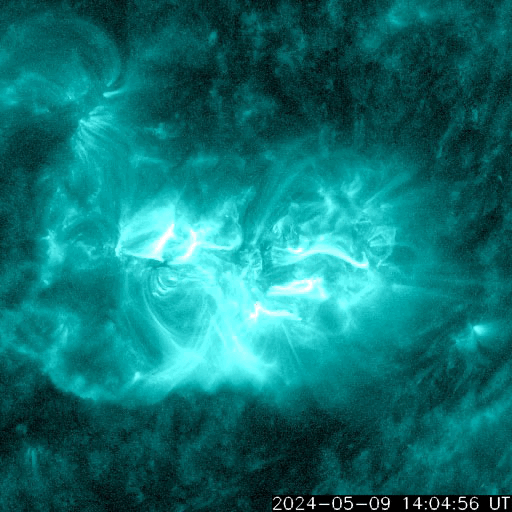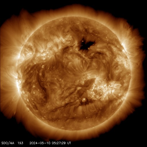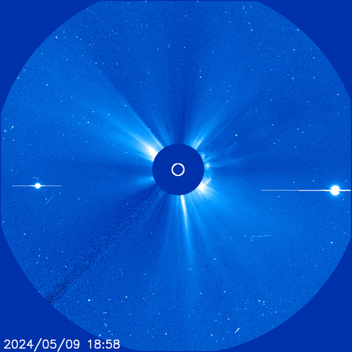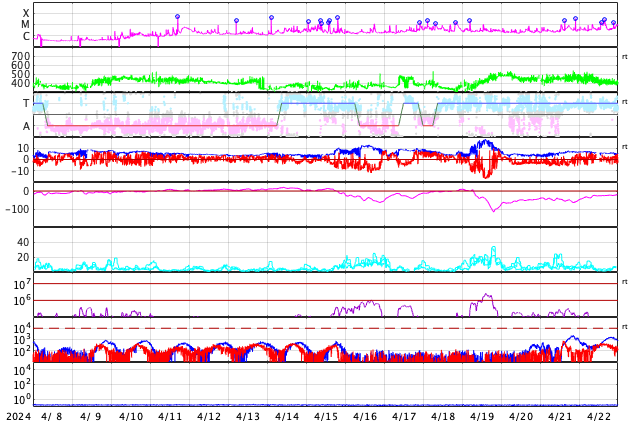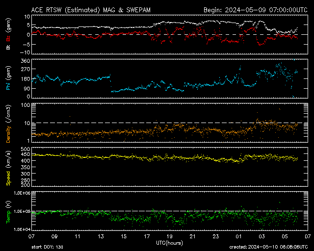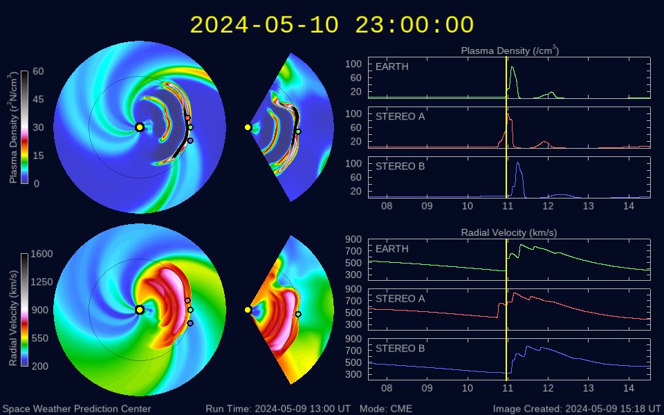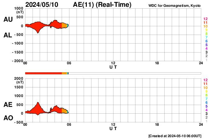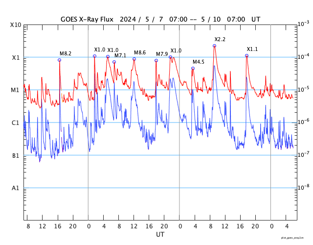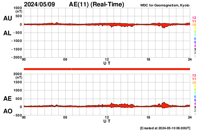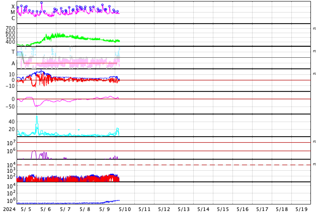 2024/ 5/10 15:10 更新 X2.2、X1.1の大規模フレアが発生しました。CMEによる太陽風の乱れが近付いています。 担当 篠原 NOAA/SWPCの太陽風予報が更新されました。 太陽風の乱れの到来の予想時刻は、 11日8時(世界時10日23時)頃と少し遅くなっていますが、 次々に飛び出したCME(コロナ質量放出)による乱れが連なって、 乱れの領域の厚みが増しています。 実際にどの様な変化がやって来るのか。 今夜以降は、太陽風の推移に注目して下さい。 磁場の強まりがやって来て南向きに大きく変化すると、 磁気圏の活動が強まる可能性も大きくなります。 太陽では、南西(右下)に進んだ3664黒点群の活動が続いています。 昨夕、9日18時(世界時9日9時)にX2.2、 今日未明、10日2時半(世界時9日17時半)にX1.1と 大規模フレアを2回起こし、 その前後に、M2.3、M3.1、M2.9、M3.7などの 中規模フレアが発生しています。 2つのXフレアとそれに伴って発生したCMEの様子を、 SDO衛星AIA131、SOHO衛星LASCO C2、C3の動画で紹介します。 CMEは、どちらも太陽を囲む様に広がっていて、 太陽風の乱れは地球に到来しそうです。 これらの乱れも含めて、 今後の太陽風は複雑な変化をしそうです。 X線グラフは、 グラフの後半でフレアの発生が少なくなっています。 3644群の活動はこのまま穏やかになるのか、 しばらく休んで再び活発になるのか、 引き続き注目してください。 太陽風は、速度は450km/秒から420km/秒に少し下がり、 磁場強度は、4nTから6nTに少し強まって、 グラフの最後は1nTと弱くなっています。 磁場の南北成分は、磁場が少し強まったところで、 南向きの変化が見られ、 AE指数で500nTに達する程度の磁気圏の活動を起こしています。 現在は磁場が弱くなっているので、 この後の磁気圏の変化は小さくなりそうです。