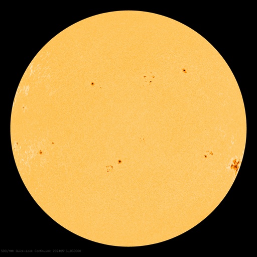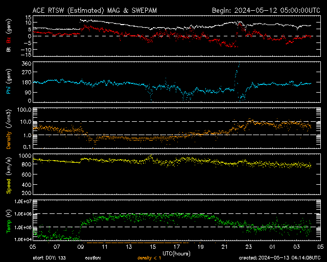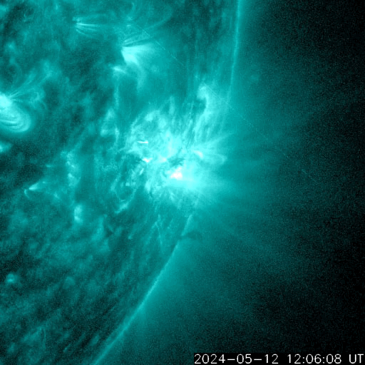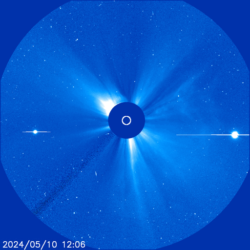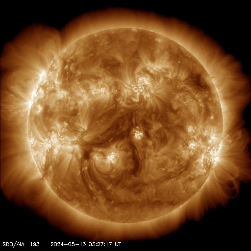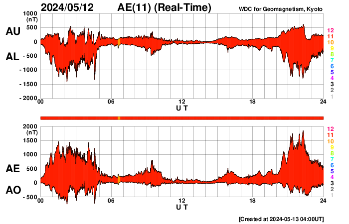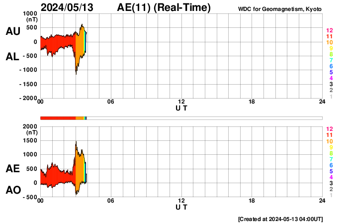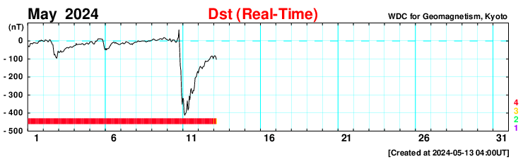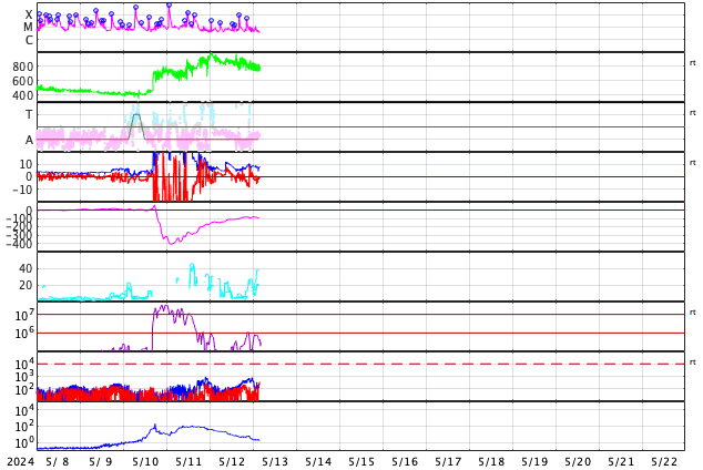 2024/ 5/13 13:11 更新 太陽風は高速の状態が続いています。磁気圏の激しい乱れは落ち着いて来ました。 担当 篠原 昨夕、12日18時(世界時12日9時)に、 太陽風の急な強まりがACE衛星で観測されました。 速度は既にかなり高速でしたが、 830km/秒から900km/秒へ再び高まり、 5nTと平均的な値に戻っていた磁場強度は、 11nTへ再び強まりました。 昨日紹介したNOAA/SWPCの予報通りと言える到来でした。 注目の太陽風磁場の南北成分は、 今回は北向きに強まりました。 このため、速度はかなり高かったのですが、 磁気圏への影響は小さく、 AE指数はほとんど変化のない状態で推移しています。 その後、13日5時(世界時12日20時)頃に 磁場が南向きに切り替わったので、 磁気圏の活動が強まって、 AE指数は1800nTに達する激しい変化を記録しています。 その後も磁場の南向きの変化に対応して、 AE指数の変化も大きくなっています。 Dst指数(速報値)は、 昨日のニュース以降はゆっくり上昇して、 現在は-100nTを割るくらいまで回復しています。 現在の太陽風は、 速度は780km/秒と高速の状態が続いています。 この後、次第に下がっていく様子に注目してください。 一方、磁場強度は7nTと既に普段の状態に戻っています。 今回の非常に激しい磁気嵐をもたらした3664黒点群は、 太陽の南西の端(右下)に近付いています。 今日未明、13日1時(世界時12日16時)に X1.0の大規模フレアを起こしました。 8日昼のX1.0に始まって、 X1.0、X2.2、X1.1、X3.9、X5.8、X1.5 と大規模フレアが続き、 今日のX1.0が最後のXフレアになるかもしれません。 続いて発生したM4.8の中規模フレアにかけて、 SDO衛星AIA131の動画を掲載します。 太陽からの高エネルギーの陽子の数は、 次第に減少しています。 11日の増加により、 SOHO衛星LASCO C3の画像は、 白いノイズが増える snowstom とよばれる状態になりました。 この2日半の推移を動画で紹介します。 ![]() Dst指数(速報値)は、-100nTを割るくらいまで戻っています。 (c) 京都大学WDC ![]() 3664黒点群で発生した、X1.0、M4.8フレアの様子。 (c) SDO衛星AIA131 (NASA)、(動画加工 : 宇宙天気ニュース) ![]() 高エネルギー陽子により白いノイズが増加する snowstormとよばれる状態になりました。 (c) SOHO衛星LASCO C3 (ESA & NASA)、(動画加工 : 宇宙天気ニュース) ![]() SDO衛星のAIA193カメラによる太陽コロナの様子 (c) SDO (NASA) ![]() SDO衛星による太陽の可視光写真。マウスの矢印を写真に重ねると、黒点番号付きの写真に切り替わります。 (c) SDO (NASA) ![]() ACEが観測した太陽風の磁場(1番上の枠、白線は全体の強度、赤線は南北成分) および、太陽風の密度(3番目の橙線)、速度(4番目の黄線) (c) NOAA/SWPC ![]() AE指数(速報値) 下段のAEグラフの値が高くなると、オーロラ活動が活発化しています。 (c) 京都大学WDC ![]() ![]() 27日の太陽周期に合わせた図 太陽が同じ面を地球に向けていた27日前の変化から、今後を予想することができます。 (c) 作図:宇宙天気ニュース