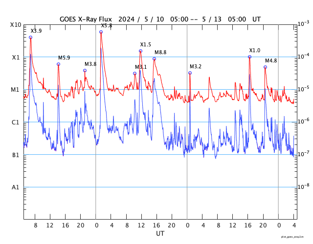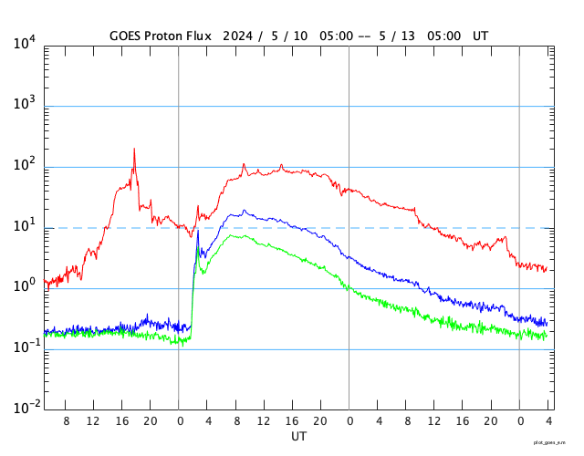 GOES衛星の太陽X線強度。赤・橙 = 0.1〜0.8 nm、青・紫 = 0.05〜0.4 nm (c) データ:NOAA/SWPC、作図:宇宙天気ニュース ![]() GOES衛星による、静止衛星軌道における高エネルギー陽子の変化 (c) データ:NOAA/SWPC、作図:宇宙天気ニュース ![]() | |||||||||||||||||||||||||||||||||||||||||||||||||||||||||||||||||||||||||||||||||||||||||||||||||||||||||||||||||||||||||||||||||||||||||||||||||||||||||||||||||||||||||||||||||||||||||||||||||||||||||||||||||||||||||||||||||||||||||||||||||||||||||||||||||||||||||||||||||||||||||||||||||||||||||||||||||||||||||||||||||||||||||||||||||||||||||||||||||||||||||||||||||||||||||||||||||||
