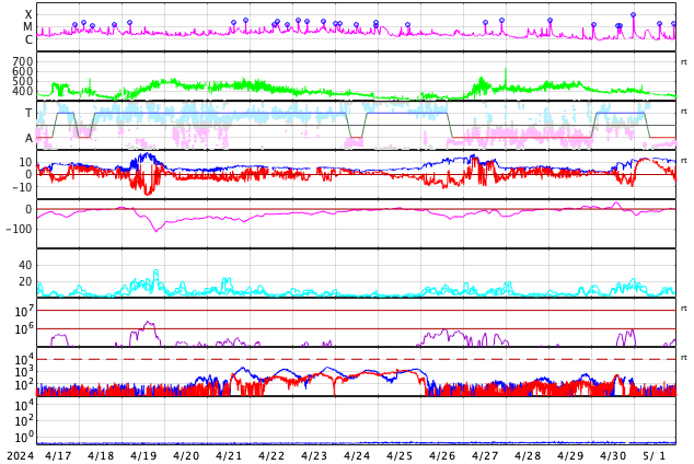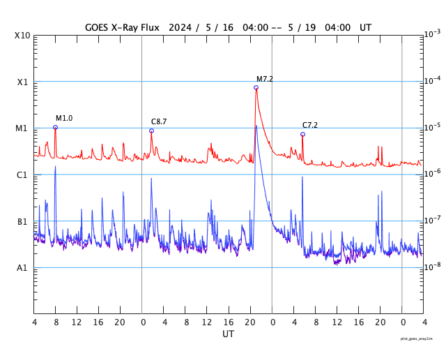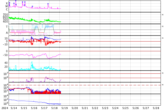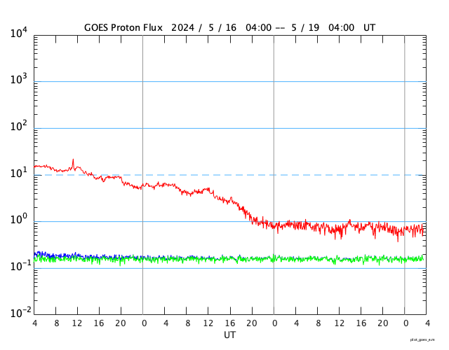 GOES衛星の太陽X線強度。赤・橙 = 0.1〜0.8 nm、青・紫 = 0.05〜0.4 nm (c) データ:NOAA/SWPC、作図:宇宙天気ニュース ![]() GOES衛星による、静止衛星軌道における高エネルギー陽子の変化 (c) データ:NOAA/SWPC、作図:宇宙天気ニュース ![]() | ||||||||||||||||||||||||||||||||||||||||||||||||||||||||||||||||||||||||||||||||||||||||||||||||||||||||||||||||||||||||||||||||||||||||||||||||||||||||||||||||||||||||||||||||||||||||||||||||||||||||||||||||||||||||||||||||||||||||||||||||||||||||||||||||||||||||||||||