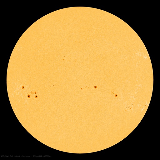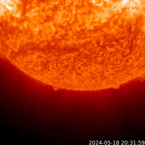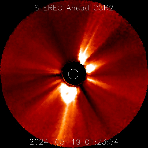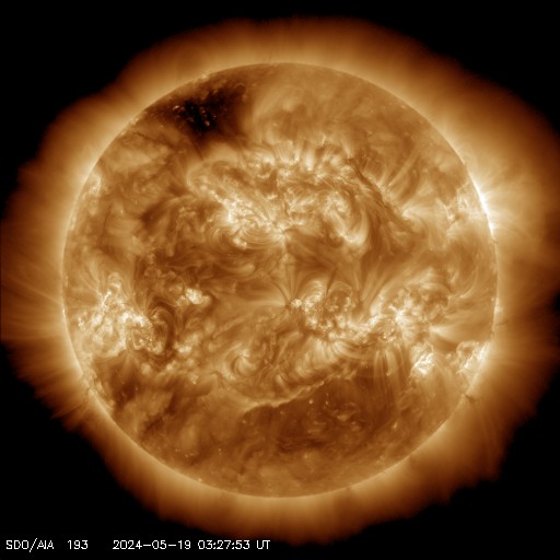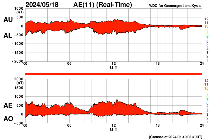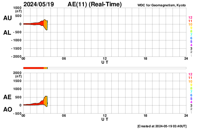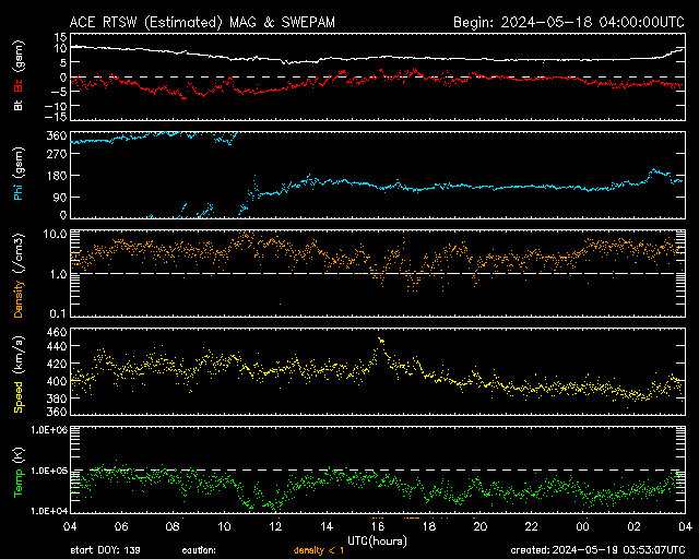 2024/ 5/19 12:55 更新 太陽風は平均的な状態です。磁気圏はやや活動的です。 担当 篠原 太陽風の速度は、 420km/秒から390km/秒へ少し下がっていますが、 平均的な状態です。 磁場強度は10nTから6nTへ下がっています。 グラフの最後で8nTへ上がる変化が見えていますが、 この後どうなるでしょうか。 磁場の南北成分は、 グラフの前半は南寄りの状態が続きました。 磁気圏の活動も高まって、 AE指数は700nTの中規模の変化が続きました。 その後、磁場は0nT付近になり、 磁気圏も穏やかになっています。 太陽風のグラフの最後で、 南北成分は弱い南寄りに変わっています。 AE指数のグラフも最後に高まりが見えています。 このまま磁場の南寄りの傾向が続くと、 磁気圏もやや活動的な状態が続くでしょう。 太陽は、昨日のニュース以降は、 中心部の3679黒点群でC7.2、 南東(左下)の3685群で、C4.1、C3.9の 小規模フレアが発生した程度で、 落ち着いた状態になっています。 今朝、19日6時(世界時18日18日21時)頃に、 南側(下側)でフィラメント噴出が発生しました。 GOES衛星SUVI 304の動画を掲載します。 この噴出により、 CME(コロナ質量放出)が太陽の下に向かって発生しています。 部分的な画像しかありませんが、 STEREO Ahead衛星COR2の動画を掲載します。 横向きの噴出になっている様で、地球への影響はなさそうです。 ![]() 太陽の南側で発生したフィラメント噴出。 (c) GOES衛星SUVI 304 (NOAA)、(動画加工 : 宇宙天気ニュース) ![]() 太陽の下側へ飛び出すCME。 (c) STEREO Ahead衛星COR2 (NASA)、(動画加工 : 宇宙天気ニュース) ![]() SDO衛星のAIA193カメラによる太陽コロナの様子 (c) SDO (NASA) ![]() SDO衛星による太陽の可視光写真。マウスの矢印を写真に重ねると、黒点番号付きの写真に切り替わります。 (c) SDO (NASA) ![]() ACEが観測した太陽風の磁場(1番上の枠、白線は全体の強度、赤線は南北成分) および、太陽風の密度(3番目の橙線)、速度(4番目の黄線) (c) NOAA/SWPC ![]() AE指数(速報値) 下段のAEグラフの値が高くなると、オーロラ活動が活発化しています。 (c) 京都大学WDC ![]() ![]() 27日の太陽周期に合わせた図 太陽が同じ面を地球に向けていた27日前の変化から、今後を予想することができます。 (c) 作図:宇宙天気ニュース