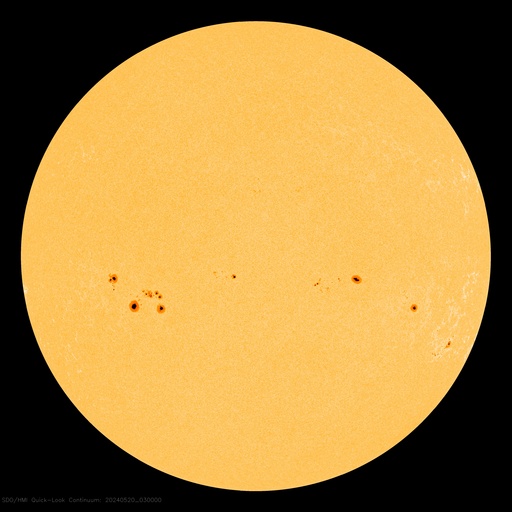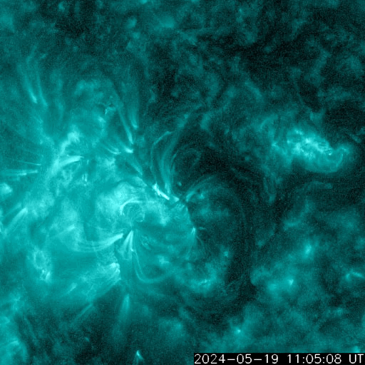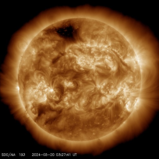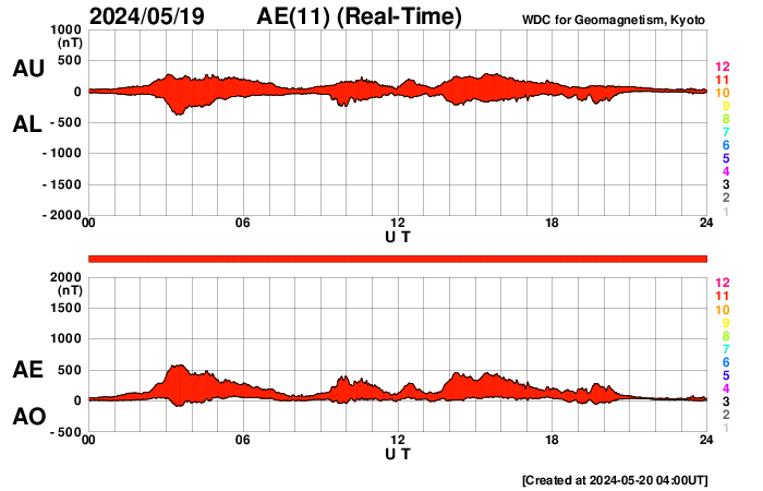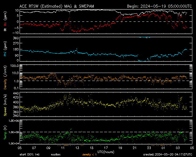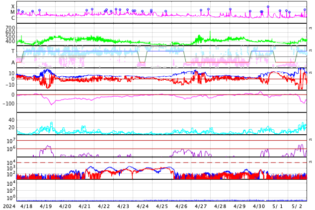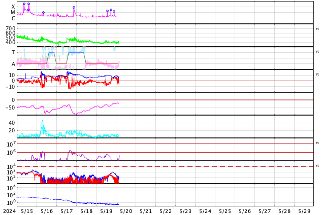 2024/ 5/20 13:18 更新 太陽風は平均的な速度が続いています。 担当 篠原 太陽風は、380〜400km/秒と平均的な速度が続いています。 磁場強度は、6〜9nTの間を上下していて、 やや強まった状態です。 磁場の南北成分は、 グラフの前半は南寄りで、後半は北寄りになっています。 AE指数もこれに合わせて、 途中まで300〜500nTの小規模の変化が続き、 その後は変化がなくなっています。 グラフの最後で、磁場は南北に変化していますが、 この後はどの様に推移するでしょうか。 SDO衛星AIA193の太陽コロナ写真では、 北半球の高緯度側にコロナホールが見えています。 緯度が高めですが、 3日後くらいから太陽風速度の高まりがやって来るかもしれません。 太陽は、南東(左下)の3685黒点群で、 M1.9、M2.5、M1.6と中規模フレアが3回発生しています。 規模が同じくらいで、発生間隔も同じくらいなので、 X線強度のグラフで3つのピークがきれいに並んでいます。 SDO衛星AIA131の動画を掲載します。
