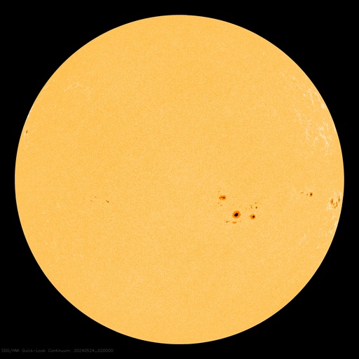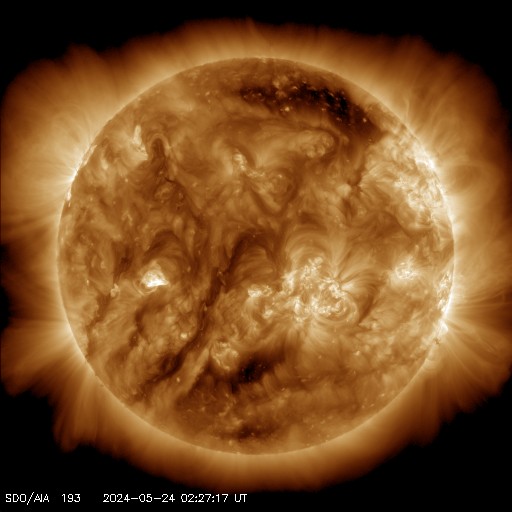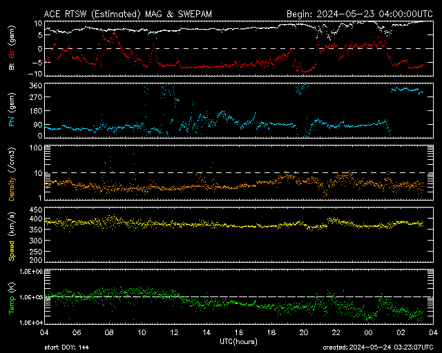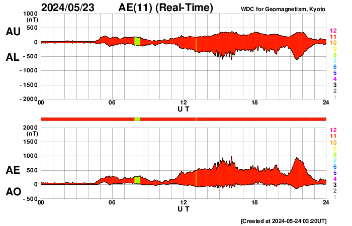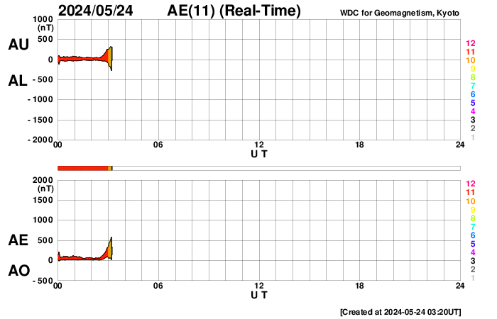 2024/ 5/24 12:23 更新 太陽風磁場が南寄りになり、磁気圏の活動が高まっています。 担当 篠原 太陽風の速度は、370km/秒前後と低速の状態で安定しています。 磁場強度は、6nTから9nTへやや強まっています。 磁場の南北成分は、昨日の午後から南寄りに偏るようになり、 -7nT程度の南向きの状態がしばらく続いています。 このため、磁気圏の活動はある程度活発になり、 AE指数は、500〜1000nTの中規模の変化が 半日ほど発生しています。 グラフの後半で太陽風磁場が弱い北向きになったため、 AE指数のグラフも後半は変化がなくなっていますが、 現在は、磁場が再び南向きに変化しているので、 磁気圏の活動も再び高まりそうです。 SDO衛星AIA193では、 北半球のコロナホールがだいぶ西に進んでいます。 緯度が高いため、 太陽風速度への影響は見られないままになりそうです。 太陽は、西の端(右端)に達した3679黒点群で、 昨日の午後から夜にかけて、 M4.2、M1.7、M1.0、M2.5と、 中規模フレアが続きました。 この後、3679群は西の端に沈んで、 見えなくなります。 北東の端(左上)の少し向こう側に活動的な領域がある様で、 フレアの輝きが度々発生しています。 どの様な領域が現れるか注目してください。 ![]() SDO衛星のAIA193カメラによる太陽コロナの様子 (c) SDO (NASA) ![]() SDO衛星による太陽の可視光写真。マウスの矢印を写真に重ねると、黒点番号付きの写真に切り替わります。 (c) SDO (NASA) ![]() ACEが観測した太陽風の磁場(1番上の枠、白線は全体の強度、赤線は南北成分) および、太陽風の密度(3番目の橙線)、速度(4番目の黄線) (c) NOAA/SWPC ![]() AE指数(速報値) 下段のAEグラフの値が高くなると、オーロラ活動が活発化しています。 (c) 京都大学WDC ![]() ![]() 27日の太陽周期に合わせた図 太陽が同じ面を地球に向けていた27日前の変化から、今後を予想することができます。 (c) 作図:宇宙天気ニュース