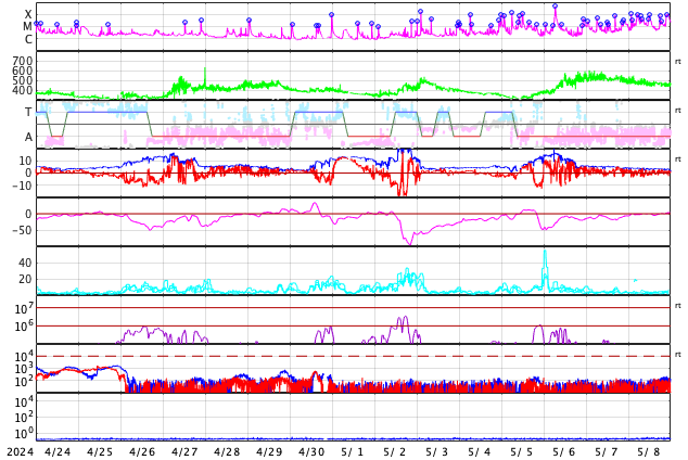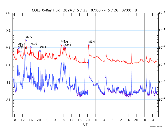 GOES衛星の太陽X線強度。赤・橙 = 0.1〜0.8 nm、青・紫 = 0.05〜0.4 nm (c) データ:NOAA/SWPC、作図:宇宙天気ニュース ![]() | ||||||||||||||||||||||||||||||||||||||||||||||||||||||||||||||||||||||||||||||||||||||||||||||||||||||||||||||||||||||||||||||||||||||||||||||||||||||||||||||||||||||||||||||||||||||||||||||||||||||||||||||||||||||||||||||||||||||||||||||||||||||||||||||||||||||||||||||||||||||||||