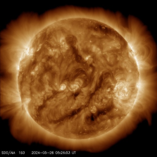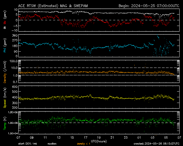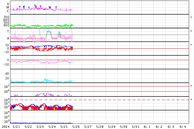 2024/ 5/26 15:16 更新 太陽風は平均的な状態です。太陽は穏やかです。 担当 篠原 太陽風は、速度は380〜400km/秒で推移し、 磁場強度は7nTから5nTへ少し下がっています。 どちらも平均的な状態です。 磁場の南北成分は、南北にゆっくり変化しています。 南向きになった頃に磁気圏の活動が高まり、 AE指数で500〜600nTの中規模の変化が発生しています。 SDO衛星AIA193の太陽コロナ写真は、 コロナホールは特に見えていません。 太陽風は穏やかな状態が続きそうです。 太陽は、西の端でC5.8の小規模フレアが発生した程度で、 穏やかに推移しています。