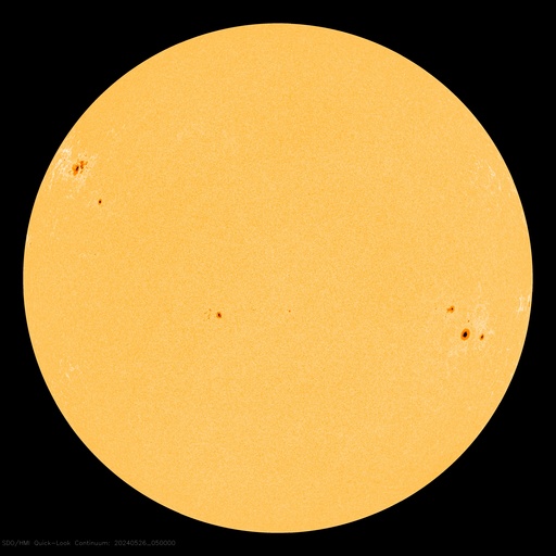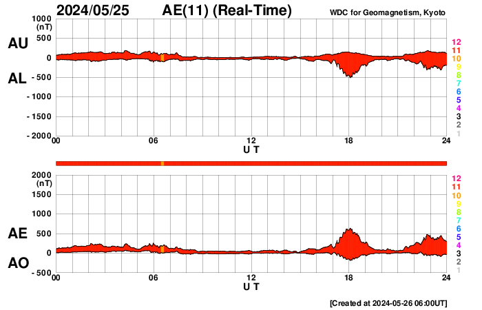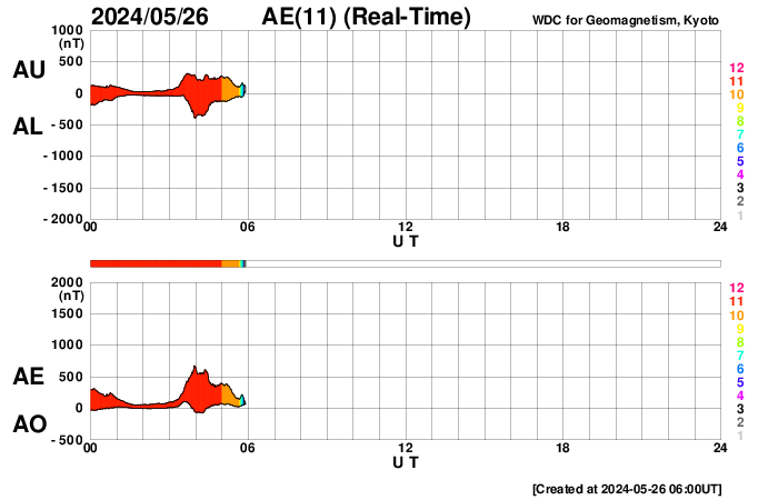 (c) SDO (NASA) ![]() SDO衛星による太陽の可視光写真。マウスの矢印を写真に重ねると、黒点番号付きの写真に切り替わります。 (c) SDO (NASA) ![]() ACEが観測した太陽風の磁場(1番上の枠、白線は全体の強度、赤線は南北成分) および、太陽風の密度(3番目の橙線)、速度(4番目の黄線) (c) NOAA/SWPC ![]() AE指数(速報値) 下段のAEグラフの値が高くなると、オーロラ活動が活発化しています。 (c) 京都大学WDC ![]() ![]() 27日の太陽周期に合わせた図 太陽が同じ面を地球に向けていた27日前の変化から、今後を予想することができます。 (c) 作図:宇宙天気ニュース