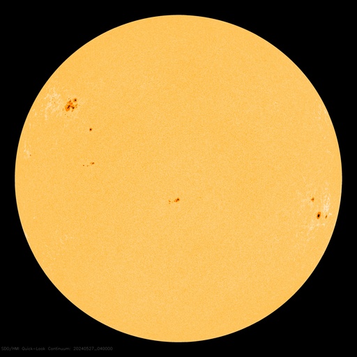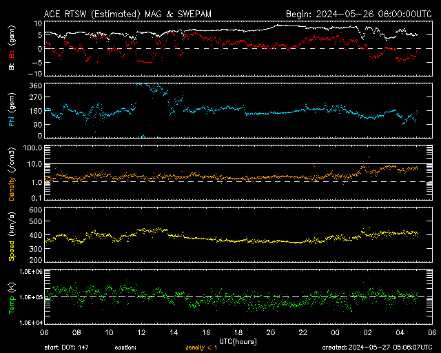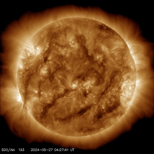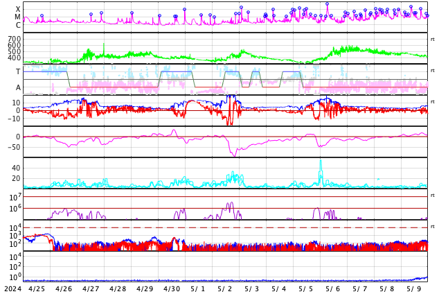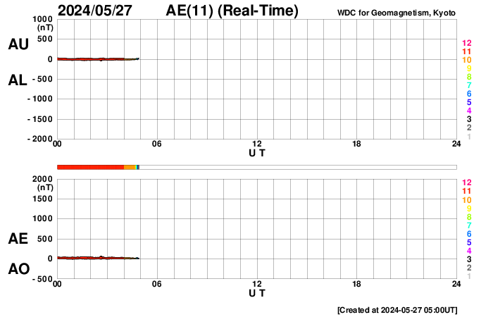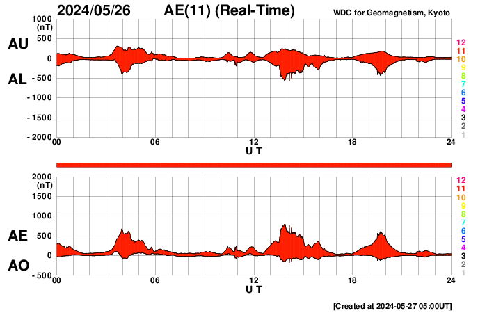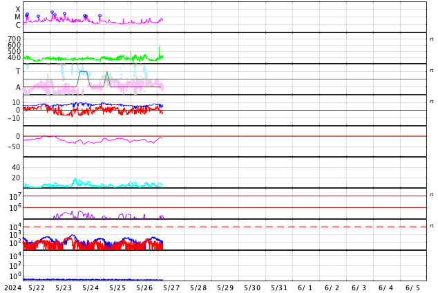 2024/ 5/27 14:06 更新 太陽風はやや低速です。Cクラスのフレアが続いています。 担当 篠原 太陽風の速度は、350〜400km/秒と やや低速の状態で推移しています。 磁場強度は、5nT前後と平均的な状態です。 磁場の南北成分は、-5nTの南向きの変化が発生して、 磁気圏の活動が一時的に強まり、 AE指数で500nTを超えるくらいの中規模の変化が発生しています。 現在の太陽風もグラフの最後は南寄りになっているので、 磁気圏の活動がやや強まるかもしれません。 SDO衛星AIA193では、コロナホールは見えていません。 太陽風は穏やかな状態が続きそうです。 太陽は、北東(左上)の3691黒点群で、 C5.2、C5.4、C5.9、C7.4、C5.5など、 小規模フレアの発生が続いています。 また、南東の端(左下)の少し向こう側で C6.9の小規模フレアが発生しました。 この後、活動的な領域が現れるかもしれません。