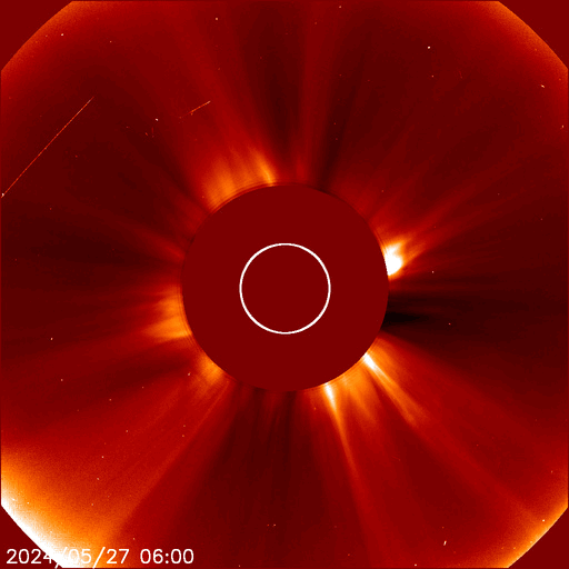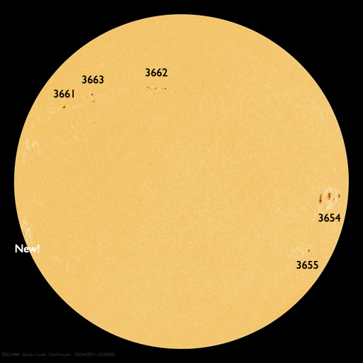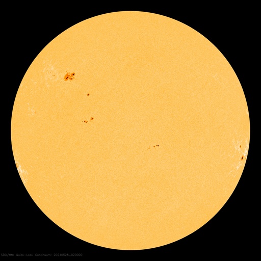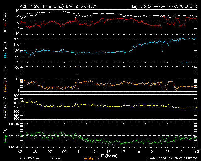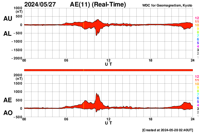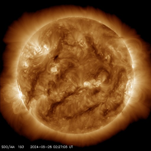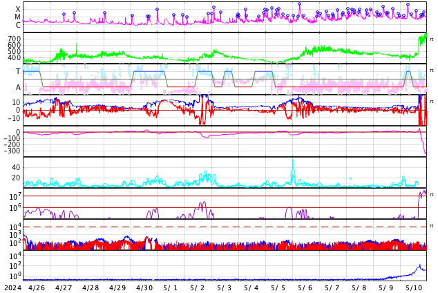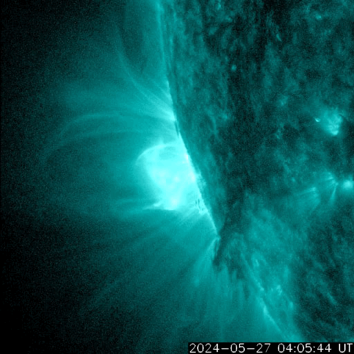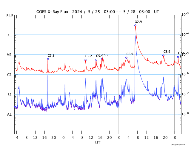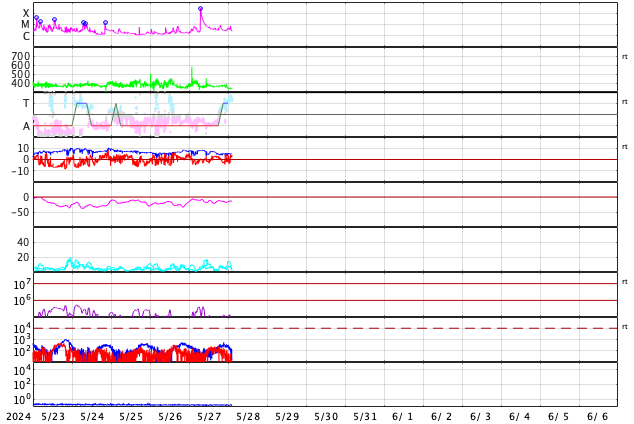 2024/ 5/28 11:59 更新 X2.8の大規模フレアが発生しました。3664黒点群が再び現れています。 担当 篠原 昨日の午後、27日16時(世界時27日7時)に、 太陽の南東の端(左下)でX2.8の大規模フレアが発生しました。 SDO衛星AIA131の動画を掲載します。 27日前の太陽画像(5月1日の左下のNew)と比べると、 今月の上旬に今期最大となるX8.7などのXフレアを多数起こしたり、 大磁気嵐の原因となるCME(コロナ質量放出)を起こした 3664黒点群と同じ場所です。 5月14日頃に太陽の西の端(右端)に沈んだ後、 およそ2週間かけて太陽の向こう側を回り、 再びこちら側に現れて大きいフレアを起こした様です。 その後も、C6.7、C7.6と小規模フレアが発生しています。 この後の活動に注目してください。 X2.8のフレアに伴って、CMEが太陽の左側に飛び出しています。 SOHO衛星ALSCO C2、C3の動画を掲載します。 地球から見て横向きの噴出になっていますが、 広がり方が大きいので、 乱れの端の方が地球へやって来るかもしれません。 太陽の北東(左上)の3691群でも、 C4.7、C8.9などの小規模フレアが発生しています。 小さい活動も頻繁に起きていて、 規模が大きくなる様であれば注意が必要になるでしょう。 太陽風は、速度が400km/秒から340km/秒へ下がり、 低速になっています。 磁場強度は、5nTと平均的な状態です。 磁場の南北成分は、 南寄りになったり、北寄りになったりしています。 南寄りの頃に磁気圏の活動がある程度高まり、 AE指数に小・中規模の変化が発生しています。 現在は太陽風の速度が下がっているので、 磁気圏の変化も小さくなるでしょう。 ![]() 南東の端で発生したX2.8の大規模フレア。 (c) SDO衛星AIA131 (NASA)、(動画加工 : 宇宙天気ニュース) ![]() 太陽の左に向かって広がるCME。 (c) SOHO衛星LASCO C2、C3 (ESA & NASA)、(動画加工 : 宇宙天気ニュース) ![]() SDO衛星のAIA193カメラによる太陽コロナの様子 (c) SDO (NASA) ![]() SDO衛星による太陽の可視光写真。マウスの矢印を写真に重ねると、黒点番号付きの写真に切り替わります。 (c) SDO (NASA) ![]() GOES衛星の太陽X線強度。赤・橙 = 0.1〜0.8 nm、青・紫 = 0.05〜0.4 nm (c) データ:NOAA/SWPC、作図:宇宙天気ニュース ![]() ACEが観測した太陽風の磁場(1番上の枠、白線は全体の強度、赤線は南北成分) および、太陽風の密度(3番目の橙線)、速度(4番目の黄線) (c) NOAA/SWPC ![]() AE指数(速報値) 下段のAEグラフの値が高くなると、オーロラ活動が活発化しています。 (c) 京都大学WDC ![]() ![]() 27日の太陽周期に合わせた図 太陽が同じ面を地球に向けていた27日前の変化から、今後を予想することができます。 (c) 作図:宇宙天気ニュース
