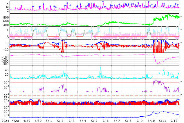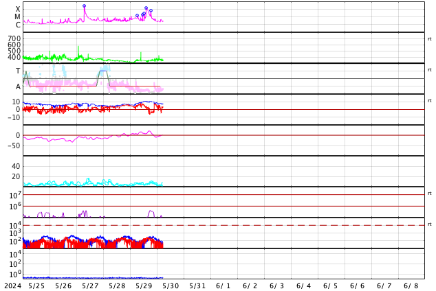 2024/ 5/30 14:57 更新 3697黒点群でX1.4の大規模フレアが発生しました。太陽風は低速です。 担当 篠原 Cクラスの小規模フレアを活発に起こしていた3697黒点群で、 昨夜、29日23時(世界時29日14時)に、 X1.4の大規模フレアが発生しました。 SDO衛星AIA131の動画を掲載します。 動画で最初に明るく光るのは、 直前に発生したM2.5の中規模フレアです。 続いて、X1.4のフレアがより激しく輝きます。 このフレアに伴って、 CME(コロナ質量放出)が太陽の左側に飛び出しています。 SOHO衛星LASCO C2、C3の動画を掲載します。 地球から見ると横向きに近い噴出ですが、 NOAA/SWPCの太陽風予報によると、 明後日の早朝、6月1日4時(世界時31日19時)に 飛び出したガスの端の方が地球に達する可能性があるとのことです。 大きい乱れにはならないと思いますが、変化に注目して下さい。 太陽では、これに続く様に、中心部北側の3691黒点群で、 30日3時半(世界時29日18時半)頃に、 M2.7とM5.7の中規模フレアが発生しています。 この後も、3697群、3691群の活動に注目して下さい。 太陽風は、350km/秒と低速の状態が続いています。 磁場強度は、8nTからゆっくり11nTへ強まり、 再び8nTへ下がっています。 磁場の南北成分は、グラフの中盤に南向きの時間帯があり、 -4nTの南向きがしばらく続いています。 ただし、変化としては小幅で、速度も下がっているため 磁気圏への影響は小さく、 AE指数は300nTの小規模の変化が発生した程度です。 現在は磁場が北寄りになっていて、 AE指数も変化がなくなっています。