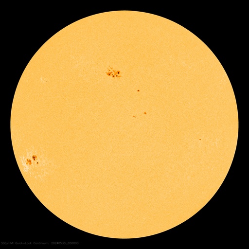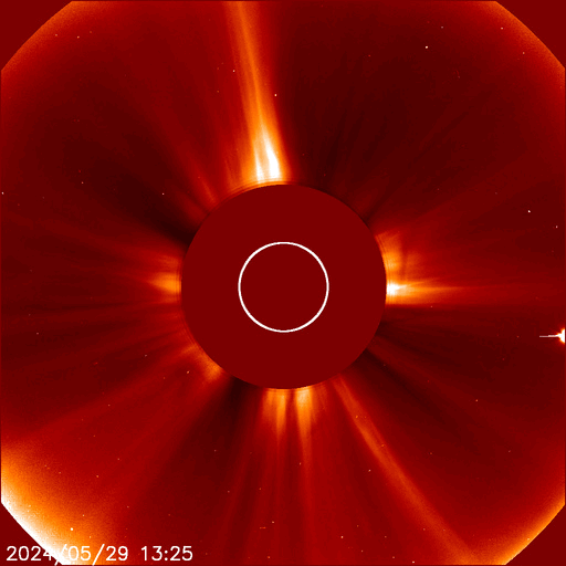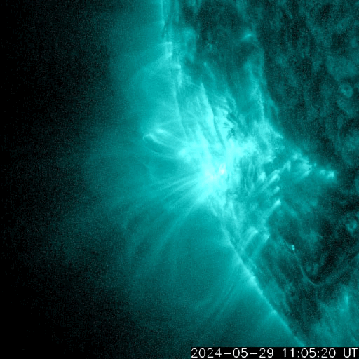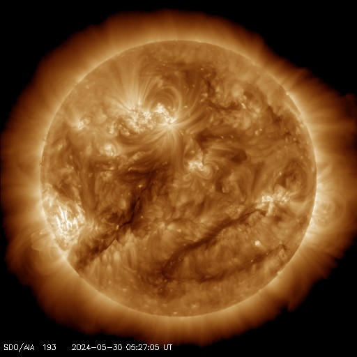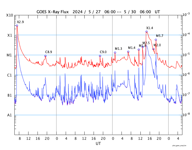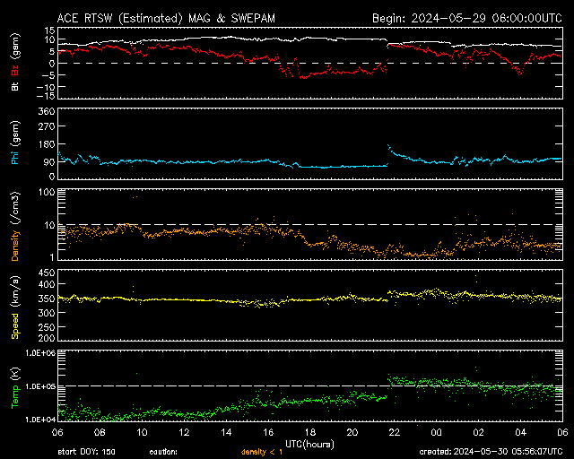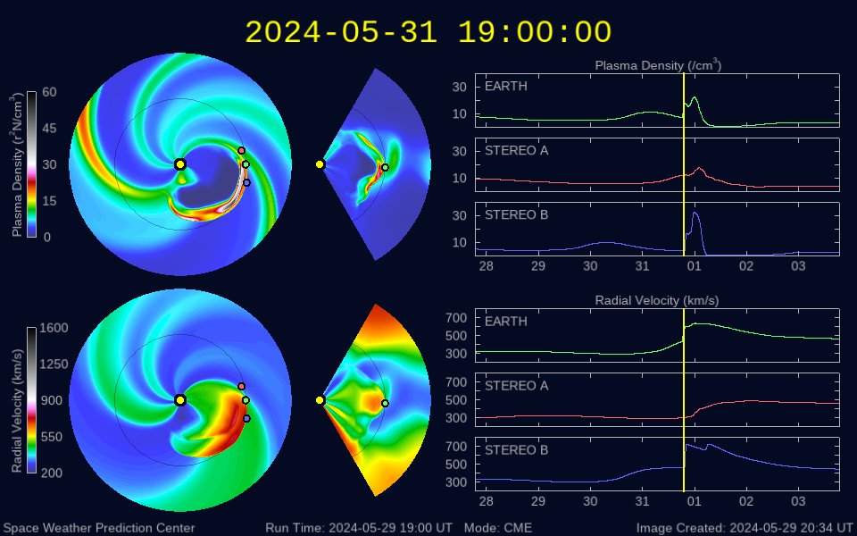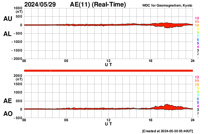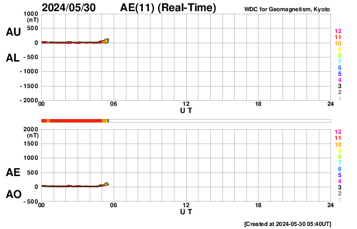 (c) SDO衛星AIA131 (NASA)、(動画加工 : 宇宙天気ニュース) ![]() 太陽の左側にCMEが広がっています。 (c) SOHO衛星LASCO C2、C3 (ESA & NASA)、(動画加工 : 宇宙天気ニュース) ![]() CMEによる太陽風の乱れは、6月1日4時(世界時31日19時)に到来する可能性があります。 (c) NOAA/SWPC ![]() SDO衛星のAIA193カメラによる太陽コロナの様子 (c) SDO (NASA) ![]() SDO衛星による太陽の可視光写真。マウスの矢印を写真に重ねると、黒点番号付きの写真に切り替わります。 (c) SDO (NASA) ![]() GOES衛星の太陽X線強度。赤・橙 = 0.1〜0.8 nm、青・紫 = 0.05〜0.4 nm (c) データ:NOAA/SWPC、作図:宇宙天気ニュース ![]() ACEが観測した太陽風の磁場(1番上の枠、白線は全体の強度、赤線は南北成分) および、太陽風の密度(3番目の橙線)、速度(4番目の黄線) (c) NOAA/SWPC ![]() AE指数(速報値) 下段のAEグラフの値が高くなると、オーロラ活動が活発化しています。 (c) 京都大学WDC ![]() ![]() 27日の太陽周期に合わせた図 太陽が同じ面を地球に向けていた27日前の変化から、今後を予想することができます。 (c) 作図:宇宙天気ニュース