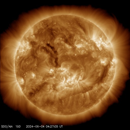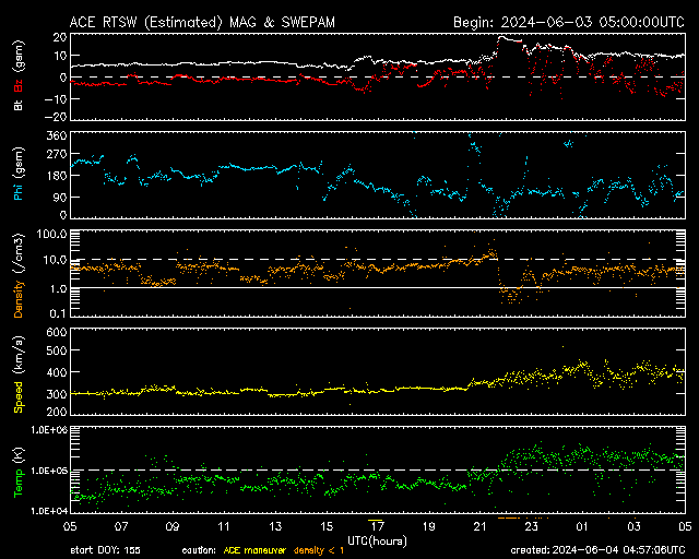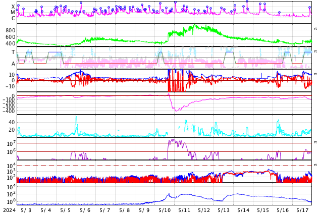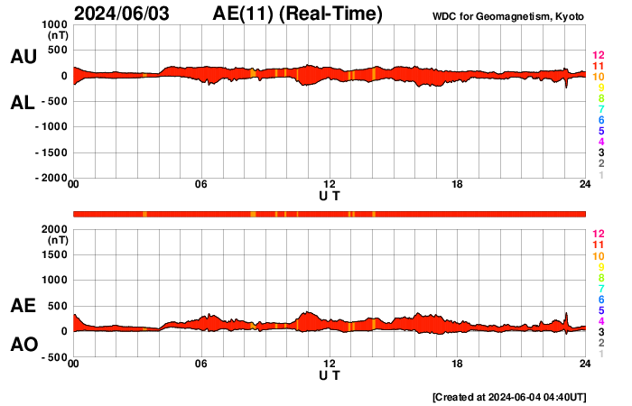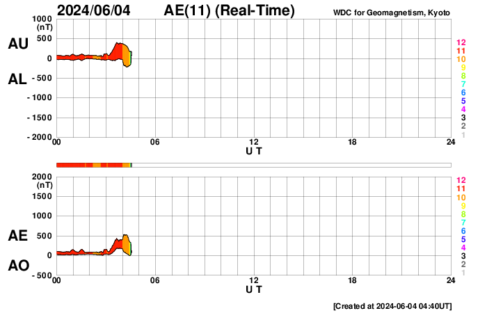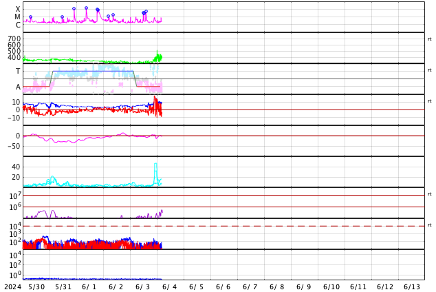 2024/ 6/ 4 13:58 更新 太陽風の乱れが到来しましたが、磁気圏は穏やかに推移しています。 担当 篠原 今朝、4日6時半(世界時3日21時半)に、 太陽風磁場が6nTから18nTへ強まる変化が ACE衛星で観測されました。 その後、磁場強度は一段下がりましたが、 現在も10nTと強まった状態です。 一方、太陽風の速度は 310km/秒から400km/秒へゆっくり上昇しています。 こちらは平均的な状態に上がった程度です。 2日未明に発生したCME(コロナ質量放出)による 太陽風の乱れが到来した様です。 乱れとしては比較的小規模に留まっています。 太陽風磁場の南北成分は、初めは北寄りに強まりました。 このため磁気圏への影響は小さく、 AE指数は穏やかな状態が続いています。 しかし、太陽風のグラフの最後辺りから -5nTを超えるくらいの南向きの強まりが見られる様になり、 AE指数も変化が起きかけています。 磁場強度が強まっている間は、南向きの変化に注意して下さい。 太陽は、中心部南側の3697黒点群で、M3.2、M2.8、 北西(右上)の3695群でM4.8と中規模フレアが発生しています。 X線グラフを見ると、 全体としては、活動は落ち着いて来ているように感じます。