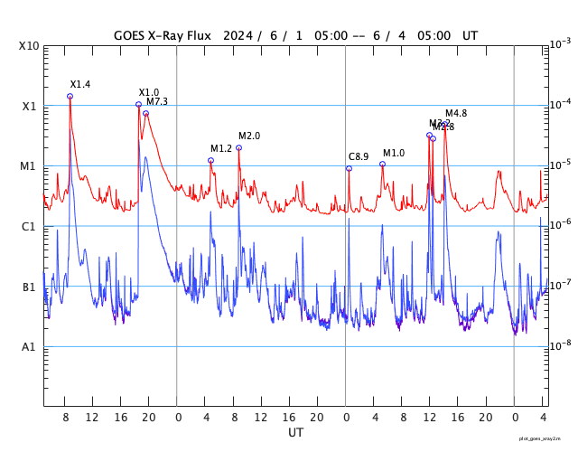GOES衛星の太陽X線強度。赤・橙 = 0.1〜0.8 nm、青・紫 = 0.05〜0.4 nm (c) データ:NOAA/SWPC、作図:宇宙天気ニュース ![]() | ||||||||||||||||||||||||||||||||||||||||||||||||||||||||||||||||||||||||||||||||||||||||||||||||||||||||||||||||||||||||||||||||||||||||||||||||||||||||||||||||||||||||||||||||||||||||||||||||||||||||||||||||||||||||||||||||||||||||||||||||||||||||||||||||||||||||||||||||||||||||||||||||||||||||||||||||||||||||||||||||||||||||||||||