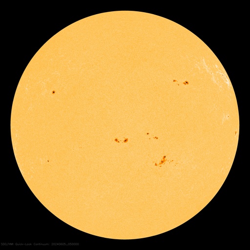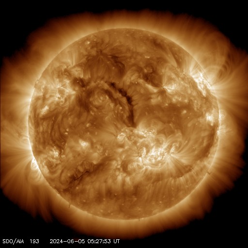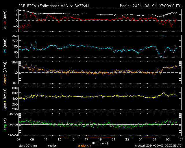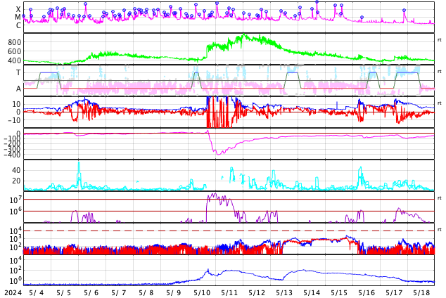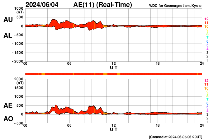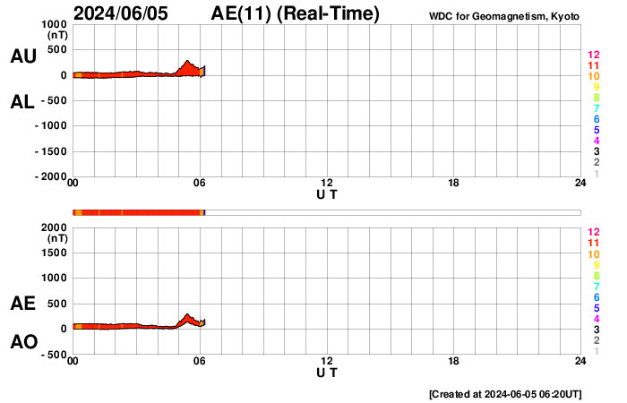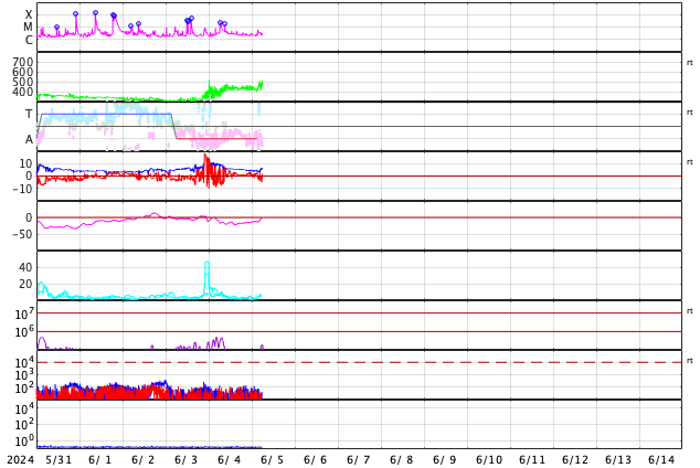 2024/ 6/ 5 15:21 更新 太陽風は平均的な状態で、磁気圏は穏やかです。 担当 篠原 太陽風は、磁場強度が5nTに下がり、 平均的な状態に戻りました。 速度は400km/秒から450km/秒へ少し上がっています。 磁場の南北成分は、弱い北寄りの傾向が続いていました。 このため磁気圏は穏やかな状態が続き、 AE指数は変化が少なくなっています。 太陽風のグラフの最後で、 磁場が弱い南向きに変化しています。 このまま南寄りの傾向に変わると、 磁気圏の活動もやや高まるでしょう。 SDO衛星AIA193では、 中心部に細長いコロナホールが見えています。 広がりは小さいので、影響も小さそうです。 太陽は、中心部南西側(右下)の3697黒点群で、 M2.4、M1.6の中規模フレアが発生しています。 また、南東の端(左下)の向こう側に活動的な領域がある様で、 5日12時(世界時5日3時)のC6.0の小規模フレアなど、 活動が時々見えています。 どの様な領域が現れるでしょうか。