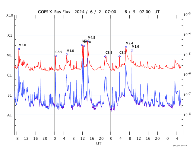 GOES衛星の太陽X線強度。赤・橙 = 0.1〜0.8 nm、青・紫 = 0.05〜0.4 nm (c) データ:NOAA/SWPC、作図:宇宙天気ニュース ![]() | ||||||||||||||||||||||||||||||||||||||||||||||||||||||||||||||||||||||||||||||||||||||||||||||||||||||||||||||||||||||||||||||||||||||||||||||||||||||||||||||||||||||||||||||||||||||||||||||||||||||||||||||||||||||||||||||||||||||||||||||||||||||||||||||||||||||||||||||||||||||||||||||||||||||||||||||||||||||||||||||||