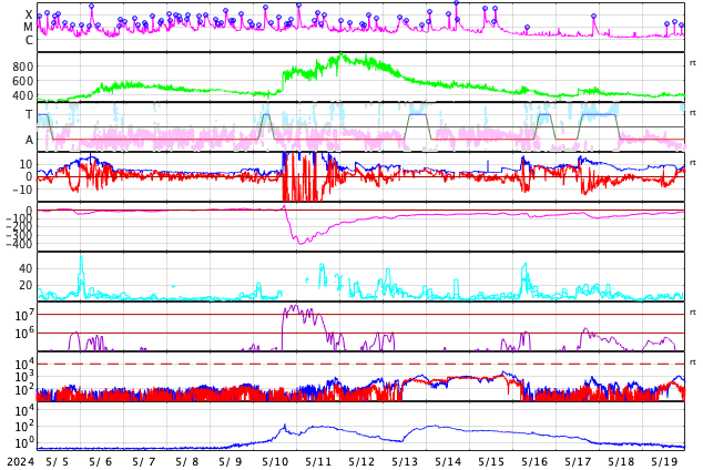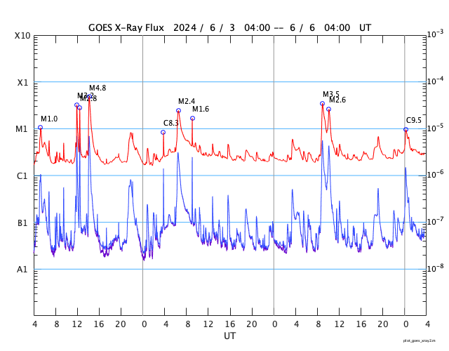 GOES衛星の太陽X線強度。赤・橙 = 0.1〜0.8 nm、青・紫 = 0.05〜0.4 nm (c) データ:NOAA/SWPC、作図:宇宙天気ニュース ![]() | ||||||||||||||||||||||||||||||||||||||||||||||||||||||||||||||||||||||||||||||||||||||||||||||||||||||||||||||||||||||||||||||||||||||||||||||||||||||||||||||||||||||||||||||||||||||||||||||||||||||||||||||||||||||||||||||||||||||||||||||||||||||||||||||||||||||||||||||||||||||||||||||||||||||||||||||