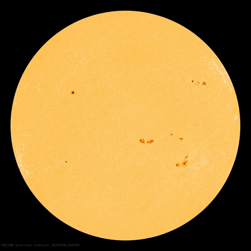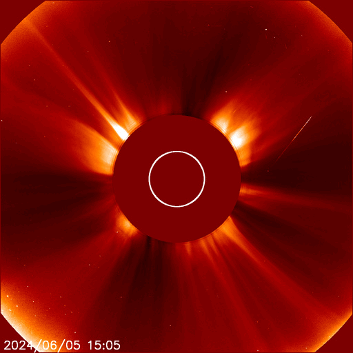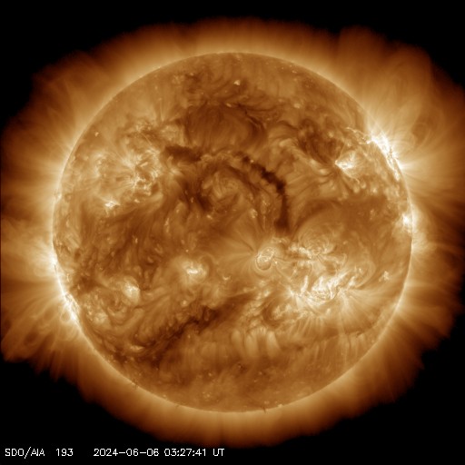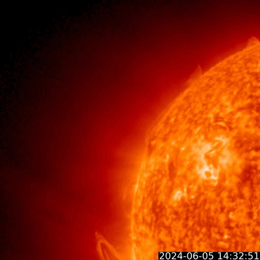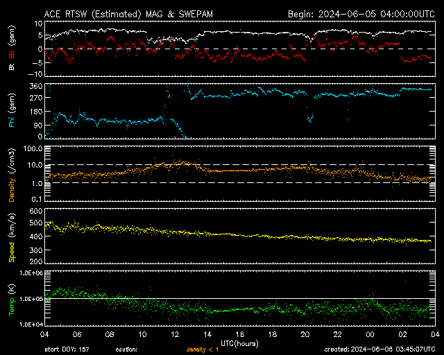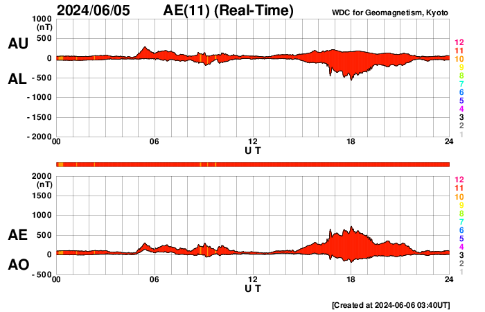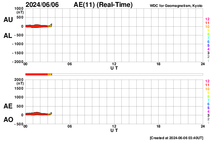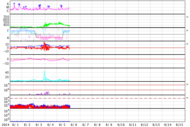 2024/ 6/ 6 12:46 更新 太陽風は低速になっています。磁気圏も概ね静穏です。 担当 篠原 太陽風の速度は、450km/秒から370km/秒へ下がり、 低速になっています。 磁場強度は、6nTと平均的な状態です。 磁場の南北成分は、グラフの中盤で弱い南向きになっています。 この影響で、AE指数に600nTの中規模の変化が発生しています。 その他の時間帯は、磁気圏は穏やかです。 太陽風のグラフの最後では、 磁場が弱い南向きに変化しています。 この傾向が続くと、 磁気圏で小規模の変化が見られる様になるでしょう。 太陽は、南西側(右下)に進んだ3697黒点群で、 M3.4とM2.6の中規模フレアが発生しています。 また、南東の端(左下)で、 C6.8、C9.5の小規模フレアが発生しています。 この後、活動的な領域が現れそうです。 深夜、6日0時(世界時5日15時)頃に、 北東側(左上)でフィラメント噴出が発生しました。 GOES衛星SUVI 304の動画を掲載します。 コロナのガスが大きく噴き上がっていて、 SOHO衛星LASCO C2、C#では、 CME(コロナ質量放出)が観測されています。 地球に対して横向きの噴出なので、影響はないでしょう。