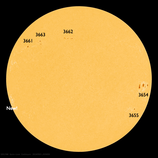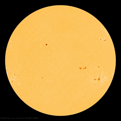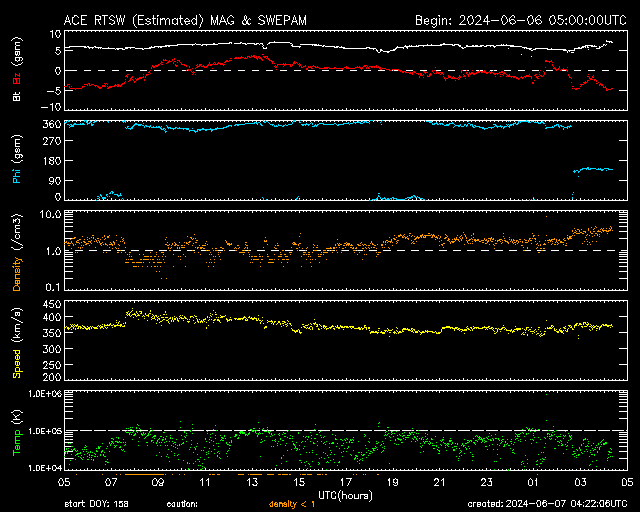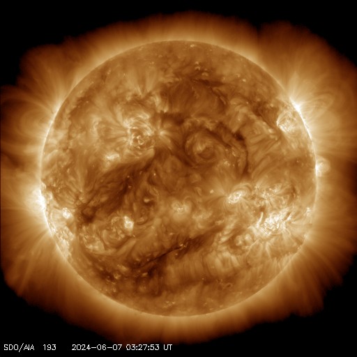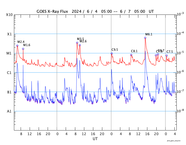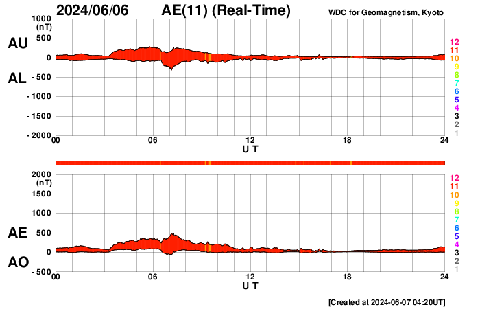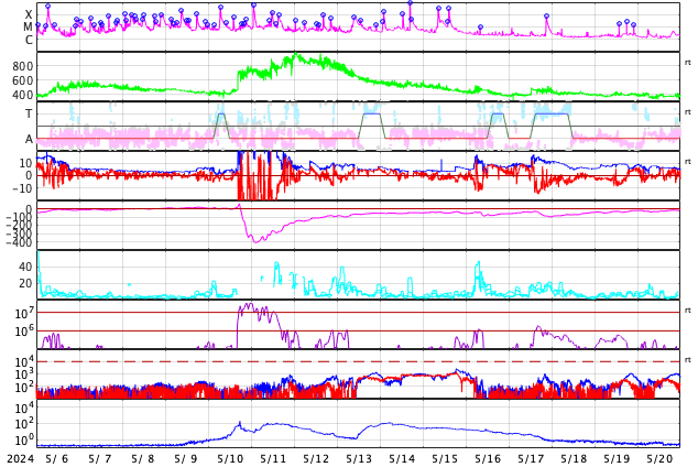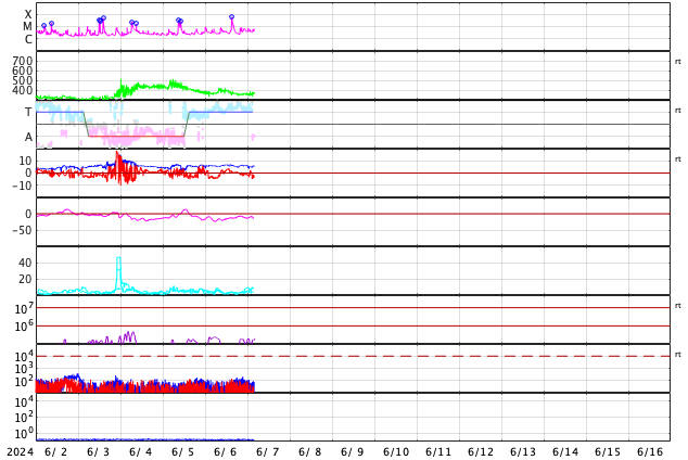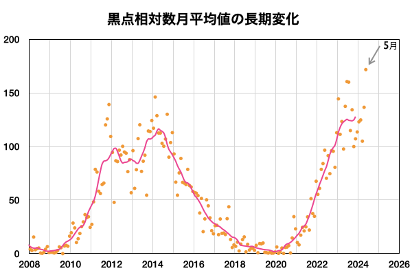 2024/ 6/ 7 13:23 更新 太陽風は低速の状態が続いています。5月の黒点相対数は 171.7 でした。 担当 篠原 WDC-SILSOより、5月の黒点相対数は 171.7 と発表されました。 これは、2023年6月の 160.5 、7月の 160.0 を超えて、 第25活動周期の月平均値の最大値です。 黒点相対数の月平均値がここまで高まったのは、 前の前の周期である第23期の極大後半の 2002年9月の 187.9 以来で、22年ぶりです。 1日値の最大は、5月16日の 211 でした。 これは、先月、4月23日に記録した 266 と比べると 一段下がって見えます。 1枚目の図で前の周期の推移を参考にすると、 極大期の後半の高まりはこれからかもしれません。 じっくりと注目を続けて下さい。 現在の太陽は、昨夜遅く、7日0時(世界時6日15時)に、 南西(右下)の3697黒点群でM6.1の中規模フレアが発生しています。 3697群は、Cクラスの小規模フレアもいくつか起こしていて、 活発な状態が続いています。 また、南東の端近く(左下)の3708群で、 C6.8の小規模フレアが発生しています。 こちらの領域にも注目して下さい。 太陽風は、360km/秒の低速の風が続いています。 磁場強度は、6〜7nTで安定しています。 磁場の南北成分は、南寄りから北寄りになり、 再び南寄りに変化しています。 この変化に合わせて、AE指数では小規模の変化が発生しています。 全体としては磁気圏は穏やかです。 27日周期の図を見ると、 ちょうど27日前に大磁気嵐が発生しています。 前の周期(5月前半)のX線グラフの激しい変化や Dst指数の猛烈な変化など見返してみて下さい。 ![]() 太陽黒点相対数の長期変化。5月の黒点相対数は 171.7 でした。 (c) 黒点データ:WDC-SILSO、作図:宇宙天気ニュース ![]() 5月の太陽黒点の推移。SDO衛星。 (c) SDO衛星AIA193 (NASA)、作図:宇宙天気ニュース ![]() 1975年以降の太陽黒点相対数の長期変化。 (c) 黒点データ:WDC-SILSO、作図:宇宙天気ニュース ![]() SDO衛星のAIA193カメラによる太陽コロナの様子 (c) SDO (NASA) ![]() SDO衛星による太陽の可視光写真。マウスの矢印を写真に重ねると、黒点番号付きの写真に切り替わります。 (c) SDO (NASA) ![]() GOES衛星の太陽X線強度。赤・橙 = 0.1〜0.8 nm、青・紫 = 0.05〜0.4 nm (c) データ:NOAA/SWPC、作図:宇宙天気ニュース ![]() ACEが観測した太陽風の磁場(1番上の枠、白線は全体の強度、赤線は南北成分) および、太陽風の密度(3番目の橙線)、速度(4番目の黄線) (c) NOAA/SWPC ![]() AE指数(速報値) 下段のAEグラフの値が高くなると、オーロラ活動が活発化しています。 (c) 京都大学WDC ![]() ![]() 27日の太陽周期に合わせた図 太陽が同じ面を地球に向けていた27日前の変化から、今後を予想することができます。 (c) 作図:宇宙天気ニュース