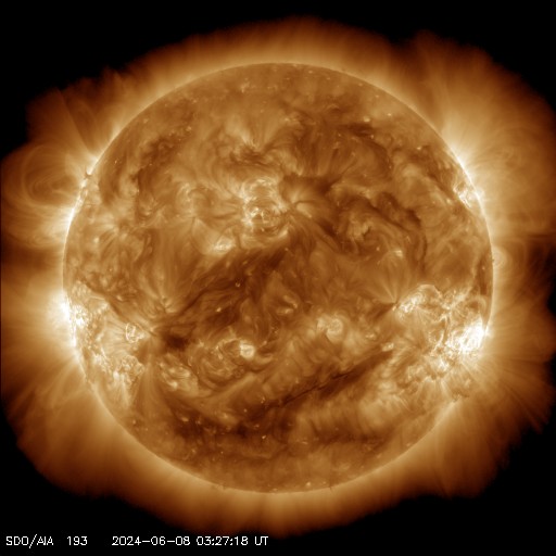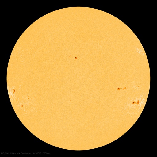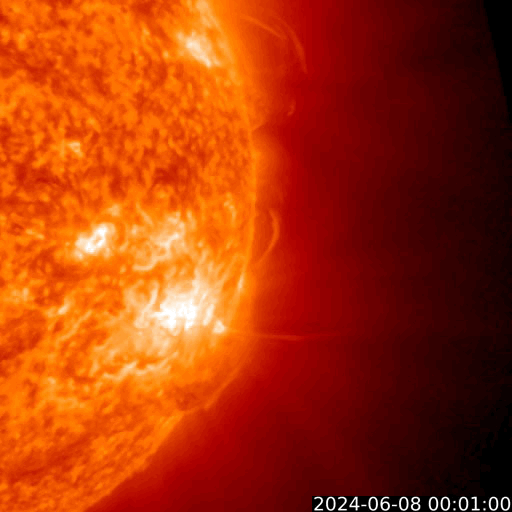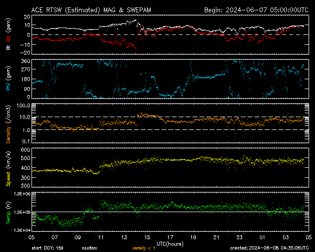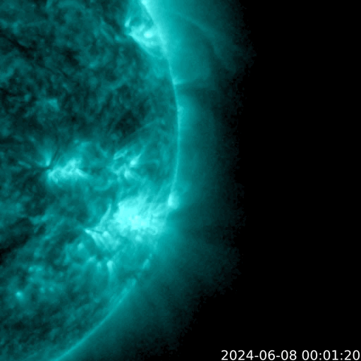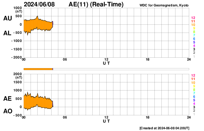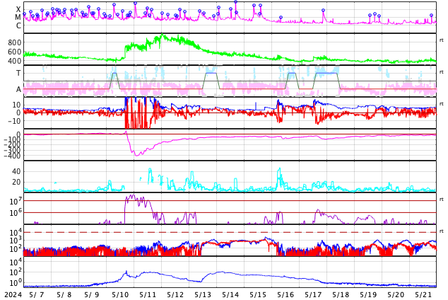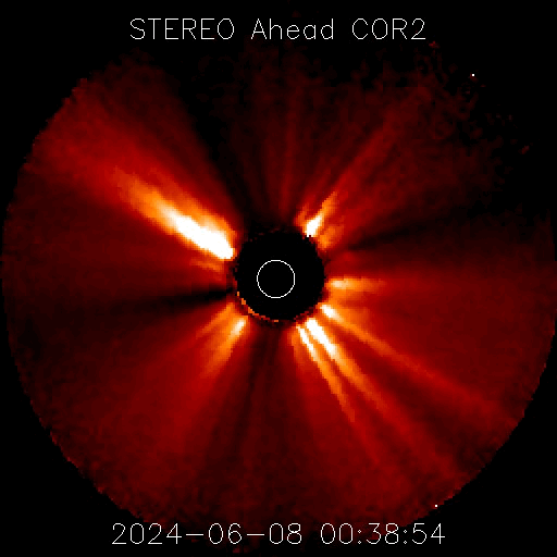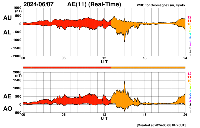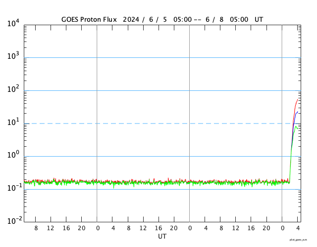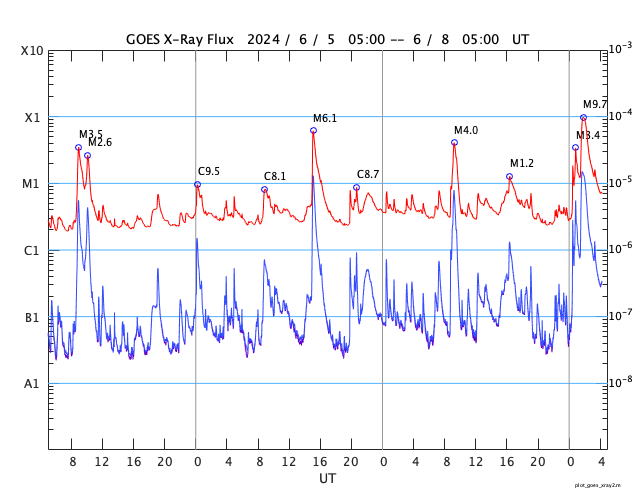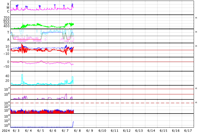 2024/ 6/ 8 13:31 更新 M9.7の中規模フレアが発生しました。CMEによる乱れが到来する可能性があります。 担当 篠原 今日の昼前、8日10時半(世界時8日1時半)に、 太陽の南西の端近く(右下)の3697黒点群で、 M9.7と、Xクラス寸前の大きい中規模フレアが発生しました。 GOES衛星SUVI 131と304の動画を掲載します。 3697群では、直前の8日9時半(世界時8日0時半)にも M3.3の中規模フレアが発生しています。 動画では、こちらが最初に小さく輝き、 続いて、M9.7が大きく輝いています。 このフレアに伴って、コロナが激しく飛び出す様子が GOES衛星SUVI 304で見えています。 STEREO Ahead衛星COR2では、 右寄りにCME(コロナ質量放出)が激しく広がっています。 この動画では、CMEは太陽の左側にも淡く広がっています。 このため、飛び出したガスは 地球にも向かっているのではないでしょうか。 到来まで2日くらいかかると考えると、 明後日、10日の昼前後でしょうか。 どの程度の太陽風の乱れがやって来るか注目して下さい。 今回のフレアが5日ほど早く発生していたら、 太陽の中心付近で発生したことになり、 その場合は、CMEの激しい領域が地球にやって来たでしょう。 太陽では、南東の端近く(左下)の3709群でも、 M4.0、M1.8と中規模フレアが発生しています。 こちらの領域にも注目して下さい。 また、GOES衛星の観測によると、 非常に高速の陽子(太陽放射線)が急増しています。 SOHO衛星LASCO C3で、snowstorm が見られそうです。 太陽風は、昨夜、7日20時(世界時7日11時)頃に 小規模の強まりがやって来た様で、 速度は、370km/秒から450km/秒を超えるくらいに、 磁場強度は、5nTから10nTを超えるくらいに それぞれ高まっています。 速度は現在も470km/秒とやや高速の状態ですが、 磁場強度は5〜8nTと平均的な値に戻っています。 5日頃に太陽の中心付近に見えていた 細長いコロナホールの影響がやって来たのでしょうか。 磁場の南北成分は、 グラフの前半と後半に南向きの強まりが発生しています。 この影響で、AE指数も中規模の変化が発生しています。 ![]() 3697黒点群で発生した、M3.3、M9.7の中規模フレア。 (c) GOES衛星SUVI 131 (NOAA)、(動画加工 : 宇宙天気ニュース) ![]() 3697黒点群で発生した、M3.3、M9.7の中規模フレア。 (c) GOES衛星SUVI 304 (NOAA)、(動画加工 : 宇宙天気ニュース) ![]() 太陽の右寄りに激しく飛び出すCME。 (c) STEREO Ahead衛星COR2 (NASA)、(動画加工 : 宇宙天気ニュース) ![]() SDO衛星のAIA193カメラによる太陽コロナの様子 (c) SDO (NASA) ![]() SDO衛星による太陽の可視光写真。マウスの矢印を写真に重ねると、黒点番号付きの写真に切り替わります。 (c) SDO (NASA) ![]() GOES衛星の太陽X線強度。赤・橙 = 0.1〜0.8 nm、青・紫 = 0.05〜0.4 nm (c) データ:NOAA/SWPC、作図:宇宙天気ニュース ![]() GOES衛星による、静止衛星軌道における高エネルギー陽子の変化 (c) データ:NOAA/SWPC、作図:宇宙天気ニュース ![]() ACEが観測した太陽風の磁場(1番上の枠、白線は全体の強度、赤線は南北成分) および、太陽風の密度(3番目の橙線)、速度(4番目の黄線) (c) NOAA/SWPC ![]() AE指数(速報値) 下段のAEグラフの値が高くなると、オーロラ活動が活発化しています。 (c) 京都大学WDC ![]() ![]() 27日の太陽周期に合わせた図 太陽が同じ面を地球に向けていた27日前の変化から、今後を予想することができます。 (c) 作図:宇宙天気ニュース
