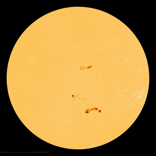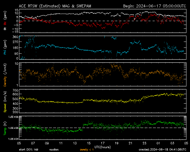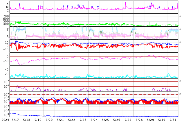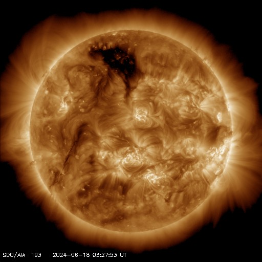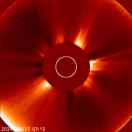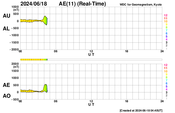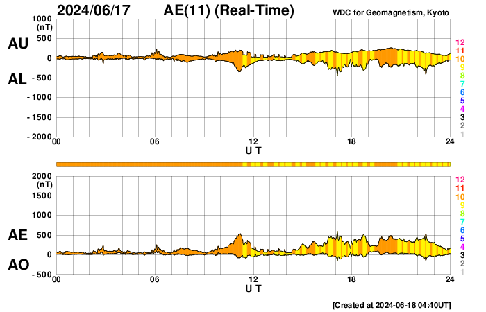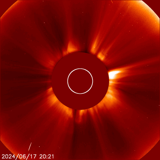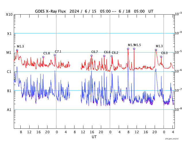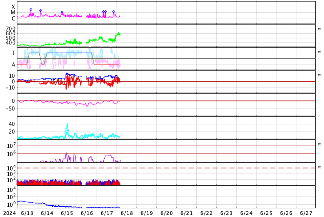 2024/ 6/18 13:41 更新 太陽の向こう側でCMEが続いています。太陽風は高速です。 担当 篠原 太陽で、CME(コロナ質量放出)の発生が続いています。 SOHO衛星LASCO C2、C3を見ると、 1つめの動画では、 17日17時半(世界時17日8時半)に左下と、 17日20時(世界時17日11時)に左上へ。 次の動画では、 18日5時半(世界時17日20時半)に下と右下へ噴出しています。 SDO衛星の画像を見ると、 太陽のこちら側で対応する変化は起きていないので、 これらのCMEは太陽の向こう側で発生した様です。 活動的な状況は続くでしょうか。 注目してください。 太陽のこちら側では、 中心部南西側(右下)の3712黒点群で、 M1.5の中規模フレアがが2回発生し、 南西の端近くの3711群でM1.3の中規模フレアが発生しています。 3712群では、小さい活動が頻繁に発生しているので、 この後も大きいフレアが発生するかもしれません。 太陽風は、速度が昨日の午後に400km/秒台に下がりましたが、 今朝から再び高まり、現在は580km/秒と高速の状態に戻っています。 磁場強度は、5nTから10nTに強まり、最後は6nTに下がっています。 小さく見えていたコロナホールの影響が やって来ているのかもしれません。 太陽風磁場の南北成分は、 グラフの中盤で弱い南寄りになっていて、 この頃にAE指数は500nTの中規模の変化が発生しています。 その後は磁場は北寄りになっていて、 AE指数の変化も小さくなっています。 SDO衛星AIA193では、 コロナホールが北東側(左上)に大きく広がっています。 緯度が高いですが、影響はやって来るでしょうか。 ![]() 太陽の向こう側で発生したと思われるCME。 (c) SOHO衛星LASCO C2、C3 (ESA & NASA)、(動画加工 : 宇宙天気ニュース) ![]() こちらも、太陽の向こう側で発生したと思われるCME。 (c) SOHO衛星LASCO C2、C3 (ESA & NASA)、(動画加工 : 宇宙天気ニュース) ![]() SDO衛星のAIA193カメラによる太陽コロナの様子 (c) SDO (NASA) ![]() SDO衛星による太陽の可視光写真。マウスの矢印を写真に重ねると、黒点番号付きの写真に切り替わります。 (c) SDO (NASA) ![]() GOES衛星の太陽X線強度。赤・橙 = 0.1〜0.8 nm、青・紫 = 0.05〜0.4 nm (c) データ:NOAA/SWPC、作図:宇宙天気ニュース ![]() ACEが観測した太陽風の磁場(1番上の枠、白線は全体の強度、赤線は南北成分) および、太陽風の密度(3番目の橙線)、速度(4番目の黄線) (c) NOAA/SWPC ![]() AE指数(速報値) 下段のAEグラフの値が高くなると、オーロラ活動が活発化しています。 (c) 京都大学WDC ![]() ![]() 27日の太陽周期に合わせた図 太陽が同じ面を地球に向けていた27日前の変化から、今後を予想することができます。 (c) 作図:宇宙天気ニュース