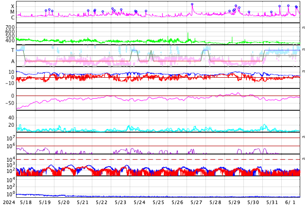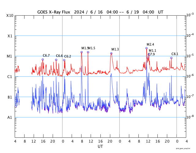 GOES衛星の太陽X線強度。赤・橙 = 0.1〜0.8 nm、青・紫 = 0.05〜0.4 nm (c) データ:NOAA/SWPC、作図:宇宙天気ニュース ![]() | ||||||||||||||||||||||||||||||||||||||||||||||||||||||||||||||||||||||||||||||||||||||||||||||||||||||||||||||||||||||||||||||||||||||||||||||||||||||||||||||||||||||||||||||||||||||||||||||||||||||||||||||||||||||||||||||||||||||||||||||||||||||||||||||||||||||||||||||||||||||||||||||||||||||||||||||