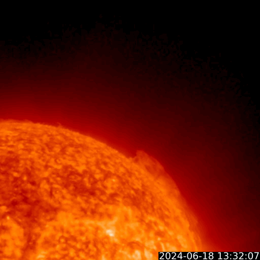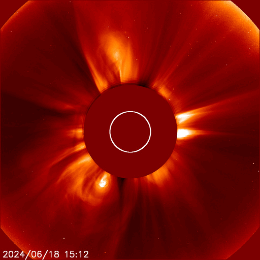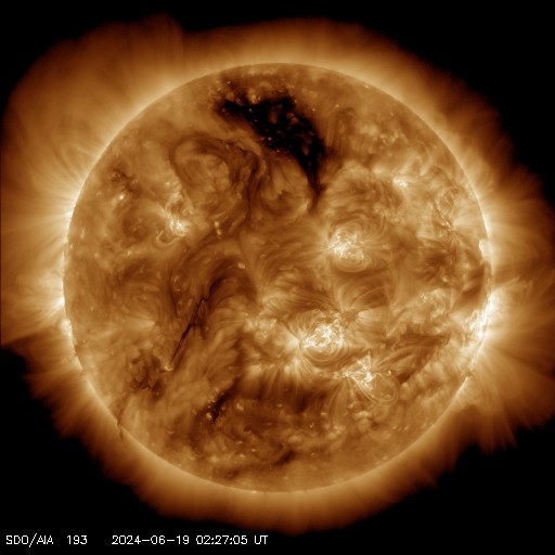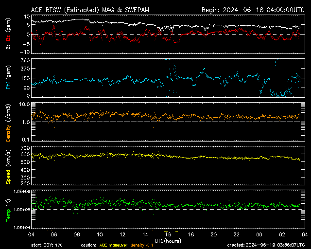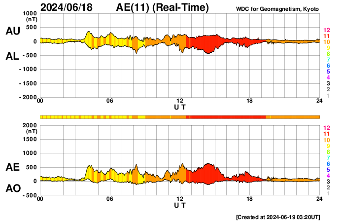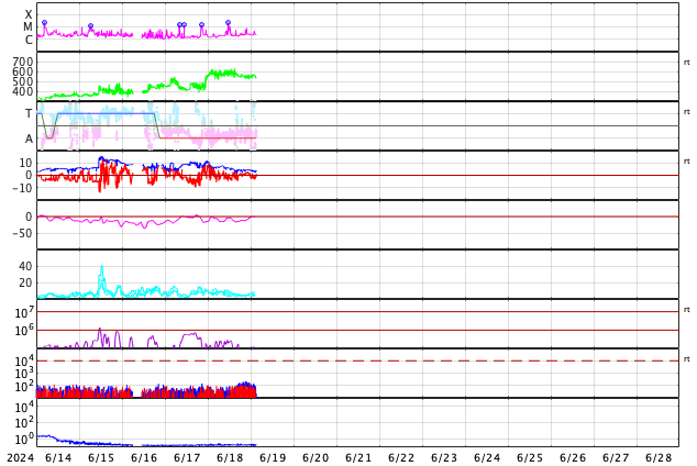 2024/ 6/19 12:37 更新 太陽風は高速の状態が続いています。中規模フレアが発生しています。 担当 篠原 太陽風の速度は、 580km/秒から550km/秒へ少し下がっていますが、 高速の状態が続いています。 磁場強度は、7nTから3nTへ下がり、 やや弱くなっています。 高速風の領域は、後半に入ったのかもしれません。 磁場の南北成分は、 0nT付近で南寄りになったり、北寄りになったりしています。 AE指数も、500nT程度の変化が発生したり静かになったりと、 太陽風磁場とともに変化しています。 SDO衛星AIA193では、 北半球側のコロナホールが太陽の中心線上に広がっています。 緯度が高めですが、 明後日くらいから太陽風に影響が見られるかもしれません。 速度の高まりに注目して下さい。 太陽は、南西側(右下)の3712黒点群で、 昨夜、18日20時と21時(世界時18日11時と12時)に、 M2.4とM1.1の中規模フレアが発生し、 その前後でCクラスの小規模フレアが発生しています。 活動的な状態は続いているので、引き続き注目してください。 また、今日未明、19日2時(世界時18日17時)頃に、 太陽の北西側(右上)と北西の端で、 フィラメント噴出とプロミネンス噴出が発生しました。 GOES衛星SUVI 304の動画を掲載します。 どちらも上寄りに噴出が発生していて、 SOHO衛星LASCO C2、C3でも 右上に向かってCME(コロナ質量放出)が広がっています。 地球への影響はなさそうです。