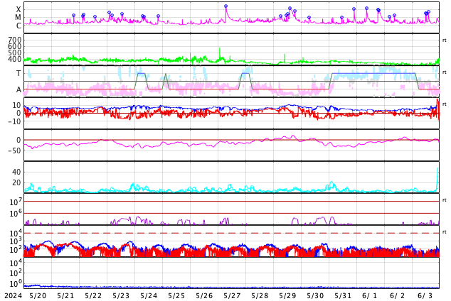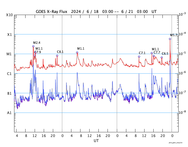 GOES衛星の太陽X線強度。赤・橙 = 0.1〜0.8 nm、青・紫 = 0.05〜0.4 nm (c) データ:NOAA/SWPC、作図:宇宙天気ニュース ![]() | ||||||||||||||||||||||||||||||||||||||||||||||||||||||||||||||||||||||||||||||||||||||||||||||||||||||||||||||||||||||||||||||||||||||||||||||||||||||||||||||||||||||||||||||||||||||||||||||||||||||||||||||||||||||||||||||||||||||||||||||||||||||||||||||||||||||||||||||||||||||