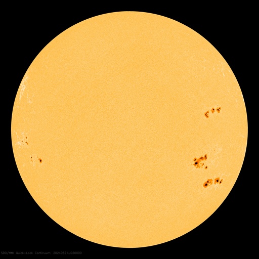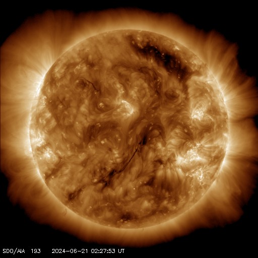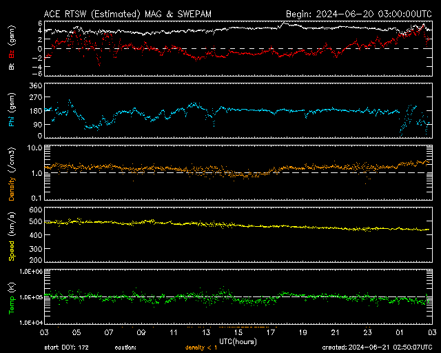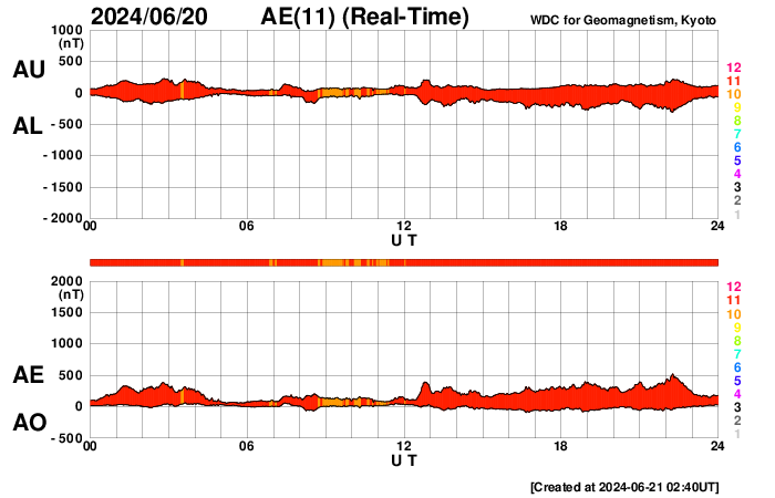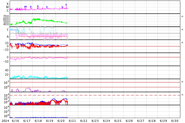 2024/ 6/21 11:51 更新 太陽風は平均的な速度で、磁気圏は穏やかです。 担当 篠原 太陽風の速度は、490km/秒から430km/秒へ下がり、 平均的な速さに戻っています。 磁場強度は、4nTと平均的な状態です。 太陽風磁場の南北成分は、 グラフの中盤で弱い南寄りになっっています。 AE指数は、この頃に300nTくらいの小規模の変化が続いています。 太陽風のグラフの後半では磁場は北向きに傾向が変わっています。 このため、AW指数も最後は変化がなくなって、 現在の磁気圏は穏やかです。 SDO衛星AIA193では、 北半球のコロナホールが北西(右上)にだいぶ進んでいます。 太陽風速度の高まりはやって来るでしょうか。 太陽は、南東の端近く(左下)の3719黒点群の活動が強まって、 21日0時(世界時20日15時)にM1.1、 21日8時(世界時20日23時)にM5.7と、 中規模フレアが2回発生しています。 どちらも短い時間の変化で、 X線グラフでは幅の細い高まりになっています。 また、20日21時半(世界時20日12時半)には、 北東の端の向こう側でフレアが発生した様です。 この後、どの様な領域が現れるでしょうか。