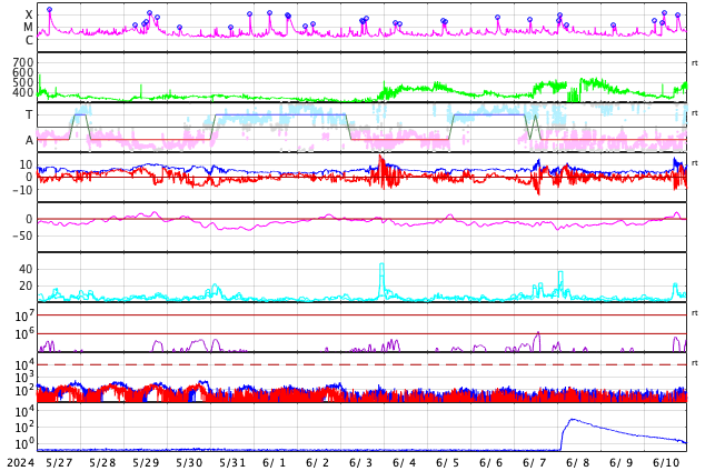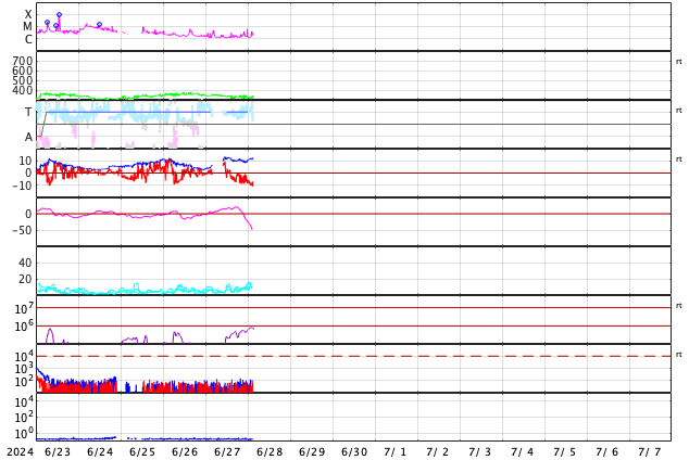 GOES衛星の太陽X線強度。赤・橙 = 0.1〜0.8 nm、青・紫 = 0.05〜0.4 nm (c) データ:NOAA/SWPC、作図:宇宙天気ニュース ![]() | ||||||||||||||||||||||||||||||||||||||||||||||||||||||||||||||||||||||||||||||||||||||||||||||||||||||||||||||||||||||||||||||||||||||||||||||||||||||||||||||||||||||||||||||||||||||||||||||||||||||||||||||||||||||||||||||||||||||||||||||||||||||||||||||||||||||||||||